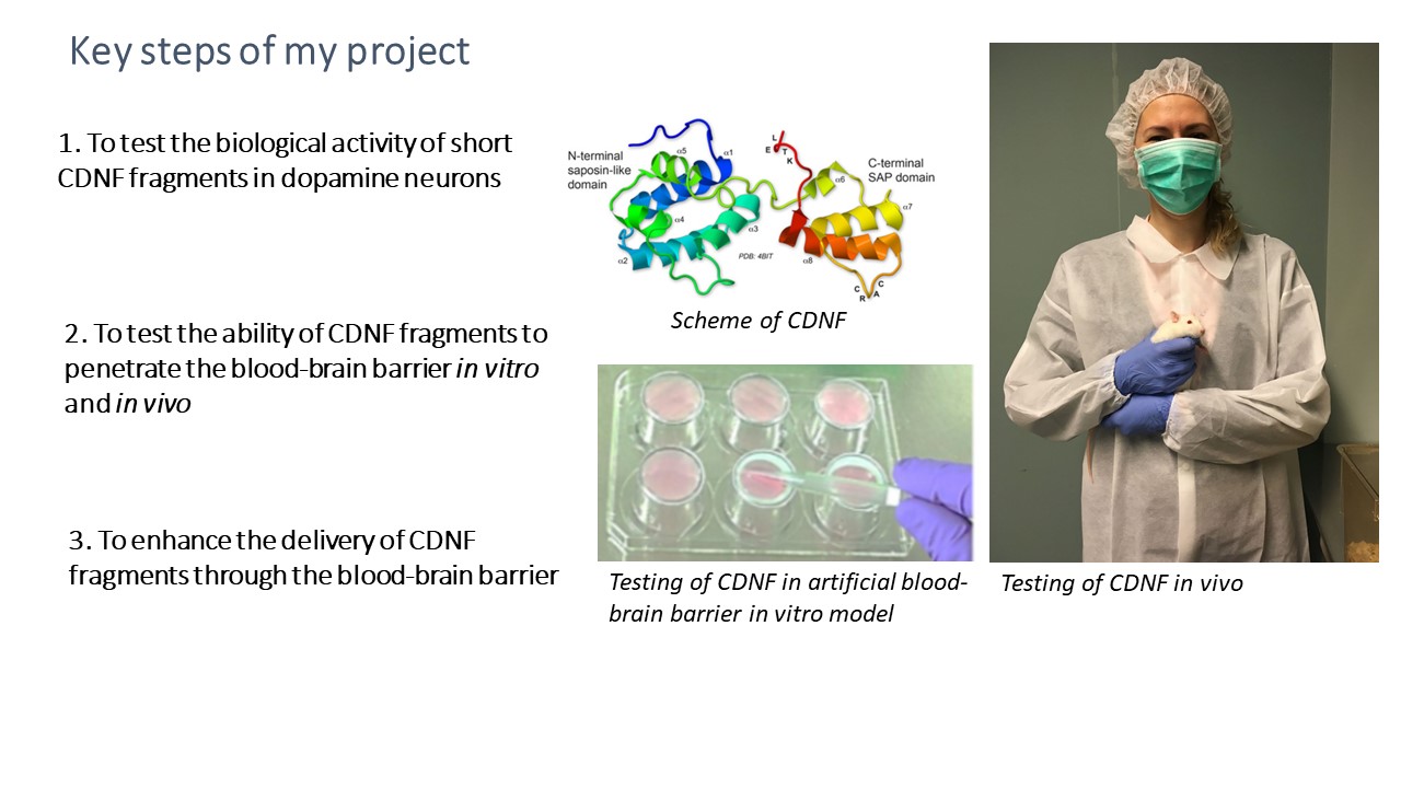 Current project aimed to develop the next generation CDNF-derived peptides able to penetrate the BBB. For that 1) the length of CDNF was be reduced to enable penetration through the BBB, 2) CDNF fragment was modified to improve its stability in the blood and tissues and 3) CDNF fragment was be conjugated to nanoparticles and brain-targeting peptide to increase its stability and ability to penetrate the BBB.