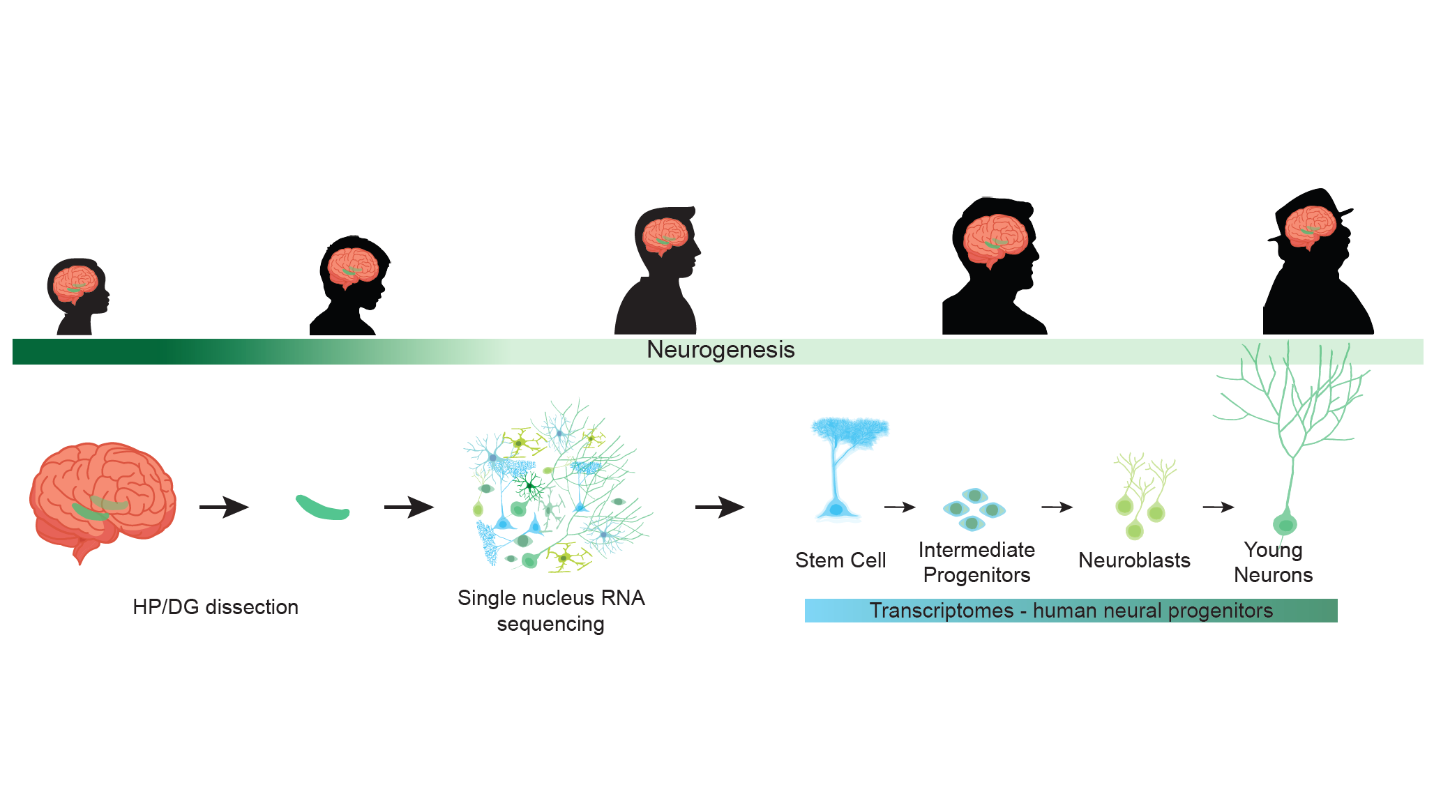 The discovery of adult neurogenesis in mammals changed the long-lasting view of the brain as an immutable structure and raised new hope for brain regeneration. In the past fifty years adult neurogenesis was found in almost all mammals and has been extensively studied in rodents. Adult born neurons have special properties that significantly influence the activity of the networks into which they integrate, playing important roles in memory formation and cognitive flexibility. Furthermore, adult neurogenesis was shown to regulate affective state and to play a role in depression. Despite the vast body of knowledge regarding rodent adult neurogenesis, the data describing it in humans is scarce. Most studies investigating human adult neurogenesis rely on immunohistology, using biomarkers established in rodents. In this study we set out to test the existence of human adult neurogenesis in an unbiased manner by analysing the transcriptome of the cells present in the hippocampus using single nucleus RNA sequencing. One of the main goals of this project was to identify individual neural progenitors in the human brain and to characterize their transcriptome. We also aimed to characterize in detail the stem cell niches using spatial transcriptomics. The Frisén laboratory showed with the help of 14C-birthdating that adult born neurons are integrating not only in the human hippocampus but also in the striatum. However, it is not known where these neurons are originating from and in which striatal structures they are integrating. Thus, we also aim to analyze the human nucleus accumbens, nucleus caudatus and the putamen and to determine if newly generated neurons are present in these structures. Our project aimed to bring a detailed characterization of human neurogenesis, answering important outstanding questions in the field, and to create protocols and datasets that will be the starting points for numerous future studies investigating human adult neurogenesis in physiological and pathological contexts.