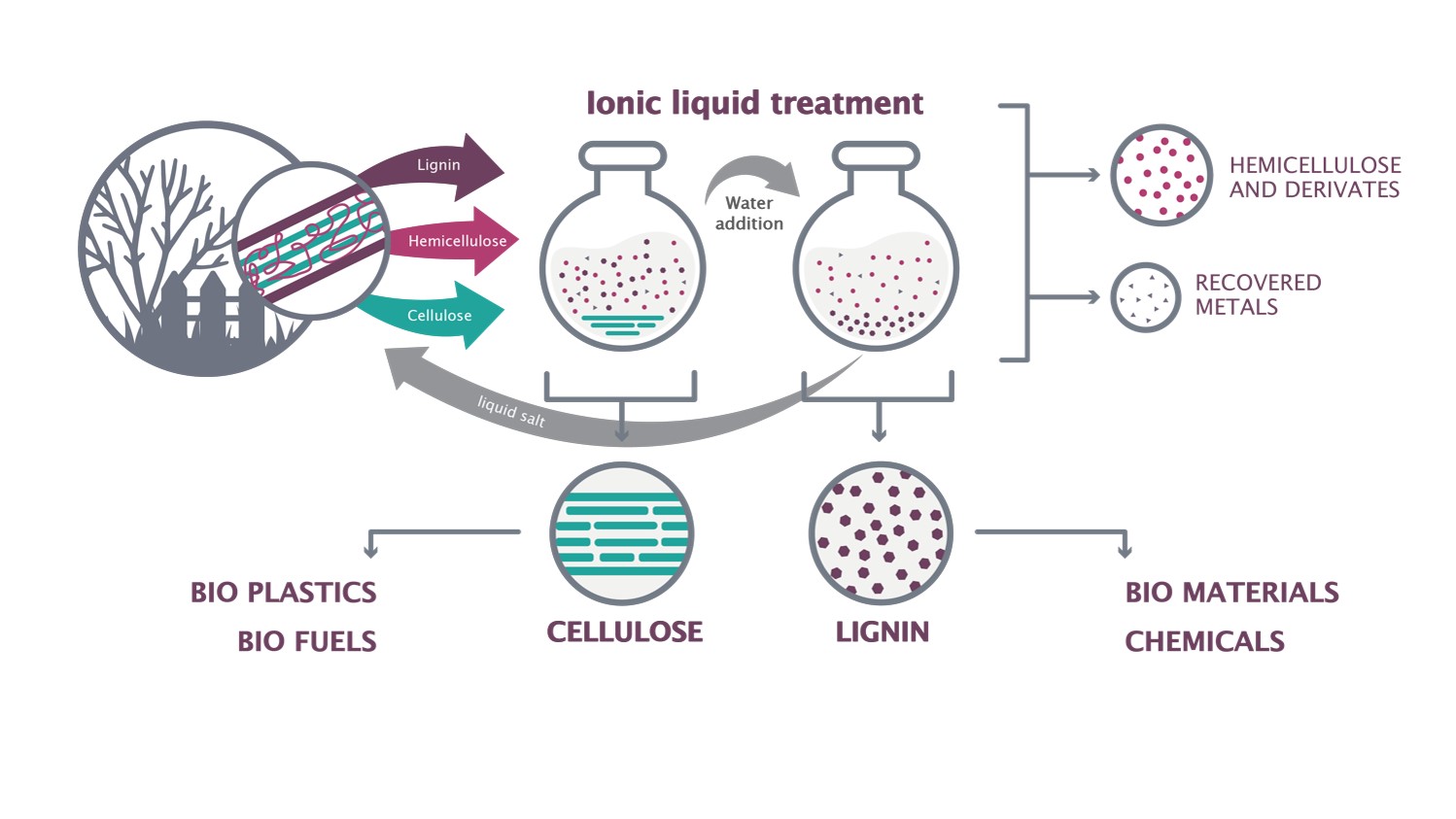 So called lignocellulosic biomass is comprised of three main polymers: lignin, cellulose and hemicellulose. For its effective valorisation, these three components are to be separated. Cellulose is a widely used material for the production of paper, hygiene products and textiles. Other applications include various packaging materials, films, thickeners, emulsifiers and additives to improve properties of plastics. Lignin hold great promise as a starting material for glues and adhesives or the use in thermoplastics. Hemicellulose can be turned into a variety of bulk and specialty chemicals.