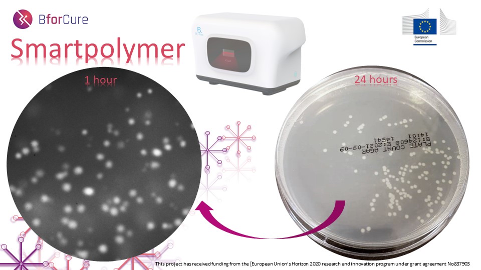 In the project "Smartpolymer" we develop a new method of analysis that uniquely combines PCR and Petri dish technologies in so called “Molecular Petri dish” technology. This is achieved by changing the PCR media from water to a specially designed polymer matrix. This matrix is able to capture every bacteria or virus in the sample separately from each other. After the PCR the matrix also captures generated multiple copies of bacterial or viruses’ genetic material nearby their “parent locations”. The principle is the same as in traditional Petri dish, however our technology allows way more fast and sensitive detection of pathogens in less than 1 hour. What is more, in combination with BforCure Chronos machine the analysis can be performed outside the big laboratories without the need of trained personnel and special equipment.