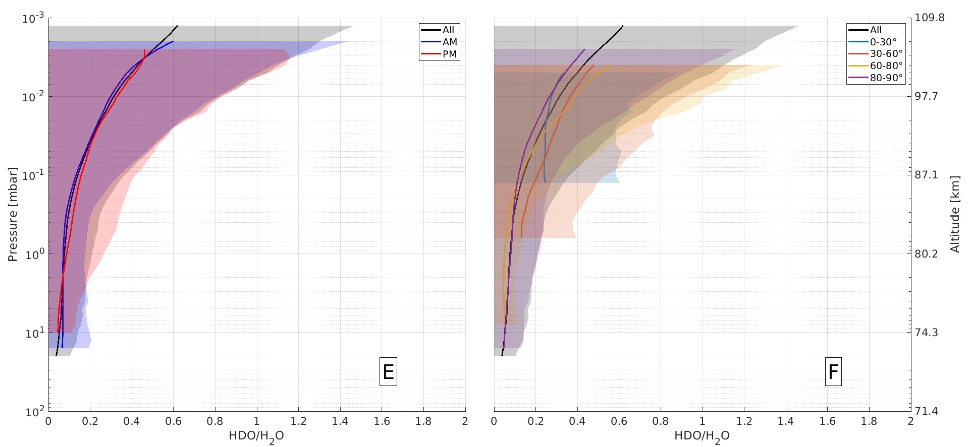 Another work focused on the H2O and HDO profiles that were measured simultaneously by SOIR. The D/H ratio in Venus's atmosphere is larger than the one on Earth by a factor of 140, which shows that water vapor escape from Venus was much larger than on Earth. Indeed, H2O escapes easier than HDO because of the slightly larger weight of the molecule. From the SOIR measurement, we observe that just above the cloud top at 70 km, the ratio is equal to the literature value, and this ratio increases with altitude by a factor of 100 above 100 km. In this work, I study the whole SOIR water database and try to explain the results by comparing them with a 1D vertical photochemical diffusion model, including CO2, H2O, and HDO photochemical reactions.