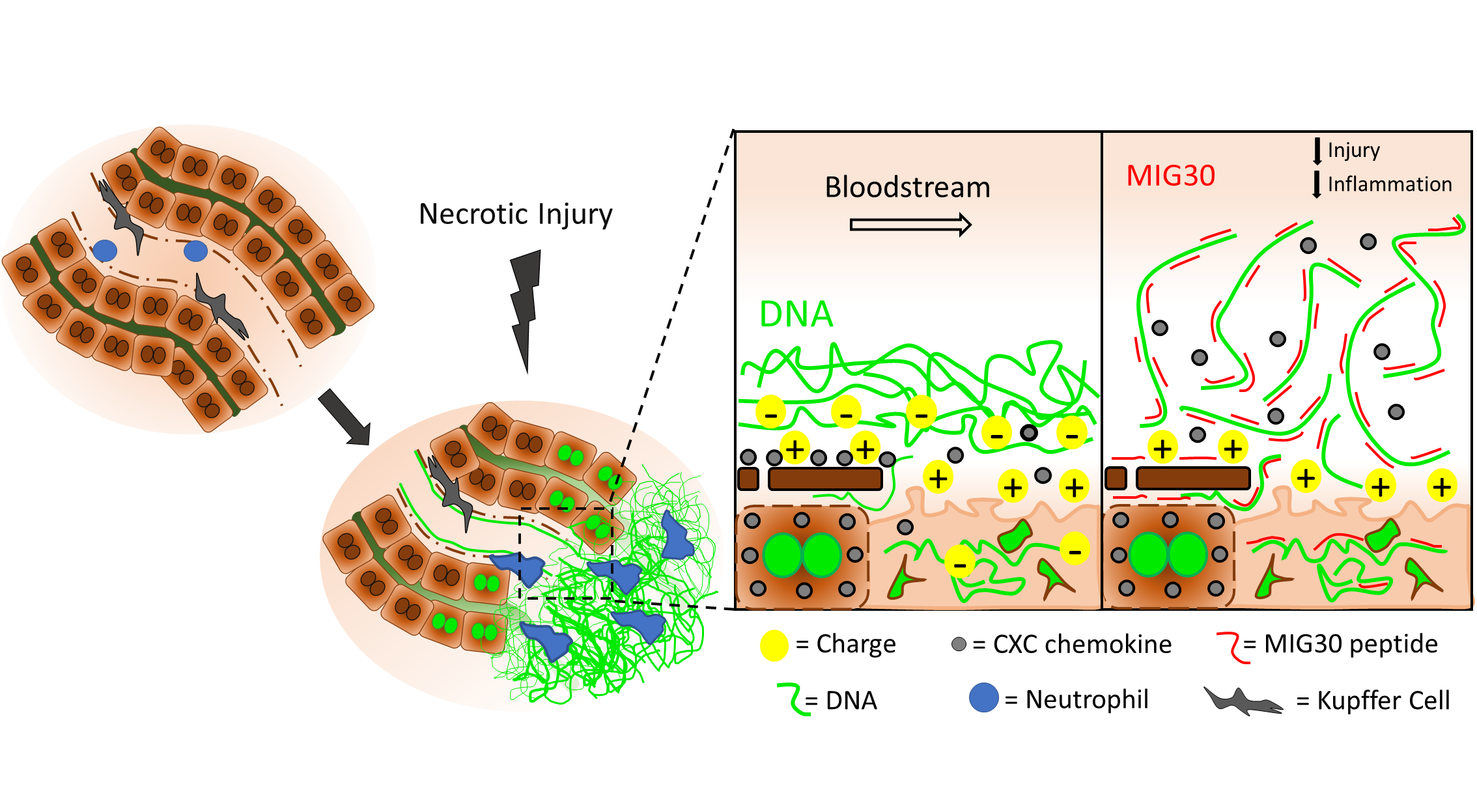 In parallel, peptide synthesis was initiated. We opted for production of CXCL9(74-103), a highly positively-charged peptide from the C-terminus of a chemokine. Intravital microscopy showed that this peptide had a high affinity for necrotic cells present in injured livers, specifically for the abundant DNA exposed after their death. Testing of this peptide in the drug-induced liver injury and liver ischemia-reperfusion models yielded interesting discoveries, especially a clear anti-inflammatory and protective effect against liver injury. Neutrophil activation and recruitment were also clearly inhibited by the peptide, showing its capacity to restrain leukocyte activity and confirming its therapeutic value in liver injury.
