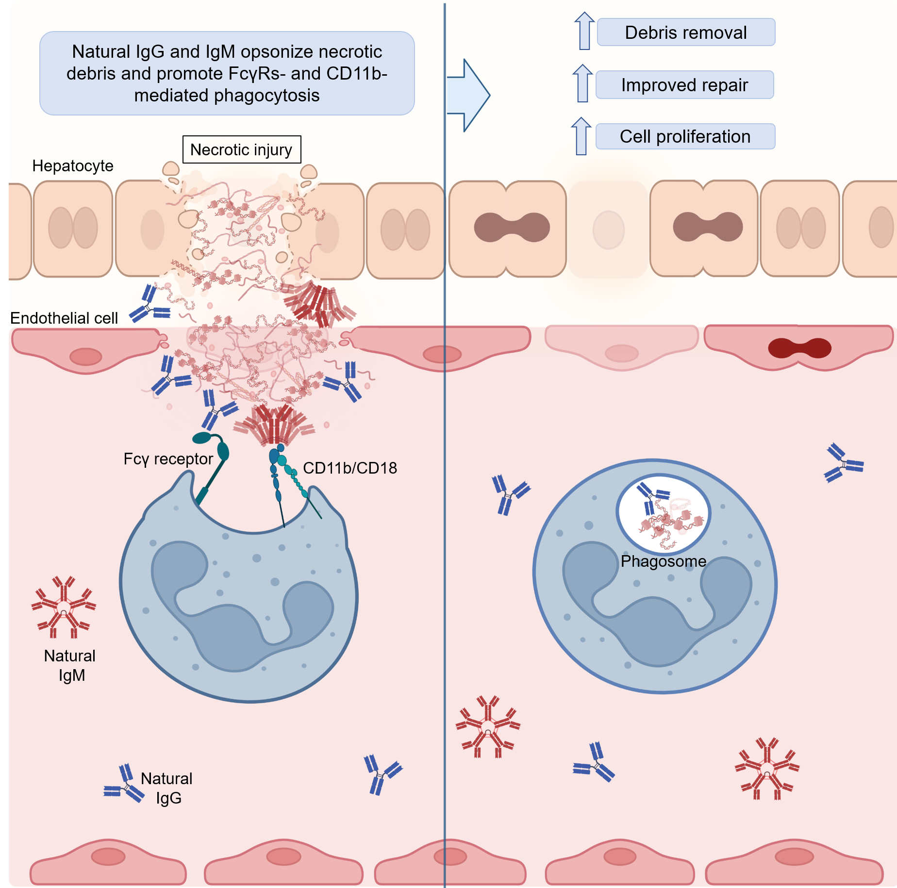 A substantial component of the project was the investigation of neutrophil-mediated phagocytosis of necrotic cell in liver injury. In this part, the main aims were to understand the molecular composition of necrotic cell debris and the mechanisms required for its clearance from injury sites. By combining the drug-induced liver injury model and intravital microscopy, we determined that necrotic debris is largely composed of DNA and an intact f-actin cytoskeleton. In vivo, necrotic debris were rapidly opsonized by IgM, IgG, C1q and C3b. Opsonization of necrotic cells by IgM and IgG occurred via auto-reactive natural antibodies, which were required for phagocytosis of necrotic debris in vitro, however, opsonization was dispensable when apoptotic bodies were used, pointing to a mechanistic difference between necrotic debris clearance and phosphatidylserine-dependent efferocytosis. Moreover, opsonization with complement C1q and C3 via the antibody-dependent classical pathway was also required for necrotic debris clearance in vitro. Clearance of necrotic cell debris in vivo was central to drive tissue recovery after drug-induced liver injury, since mice deficient in antibody production or complement presented accumulated cell debris in injury sites and a significant delay in tissue regeneration, as shown by the size of injured areas and decreased hepatocellular proliferation. In addition, phagocytosis of necrotic debris in vivo was completely rescued in Rag2-knockout mice by replenishing them with total IgM and IgG, rescuing also the capacity of the liver to regenerate. Importantly, normal wild-type mice presented an improved recovery post liver injury when supplemented with total IgM and IgG, showing that this strategy has therapeutic potential in immunocompetent individuals. In conclusion, necrotic debris clearance requires both natural antibodies and the complement system, and it is central for the recovery from tissue injury.
