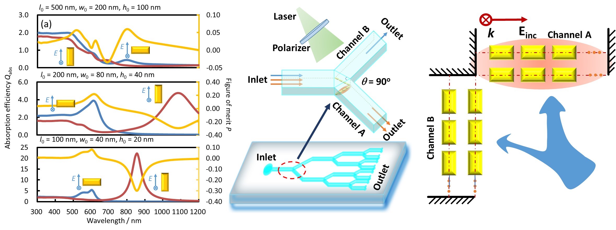 (2) To provide a novel effective micro-flow control method. This project aims to design a light-controlled microvalve that can be used to regulate fluid flow in distributary micro-channels. The microvalve consists of a nanoparticle array that is placed in the bifurcations and an external monochromatic light source. No complex external devices are required. By adjusting the characteristic parameters (wavelength, intensity, and polarization state), the monochromatic light source can be used to control the temperature of the nanoparticle array.