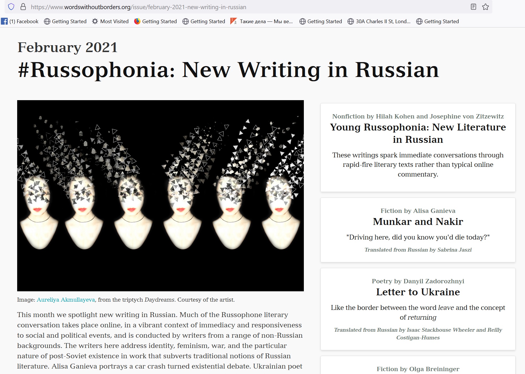 - "Young Russophonia", for "Words without Borders" translation journal, February 2021