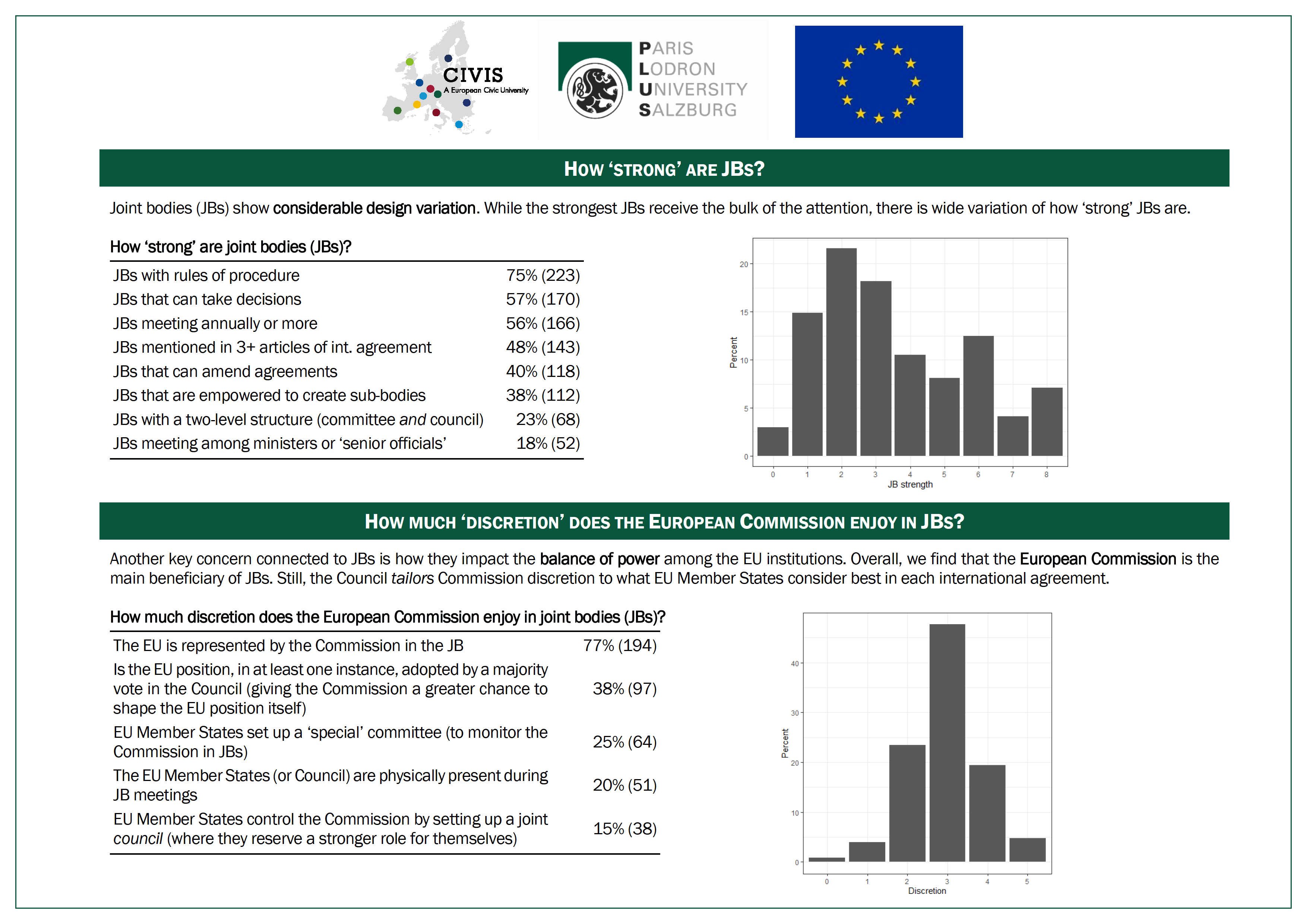 1) An article published in the Journal of European Public Policy on why some JBs are ‘stronger’ than others (e.g. meeting more frequently, at higher levels, taking decisions). We argue that stronger JBs generate greater costs and are primarily included in agreements promising greater benefits. Benefits, in turn, are greater if implementation helps the EU attain its goals (which is generally the case with bigger states), parties are interdependent (generally with geographically closer countries), and agreements with a broad scope. Drawing on an original dataset of 547 international agreements concluded by the EU since 1992 generated by this project, we find strong support for our argument. The article is available open access here: https://doi.org/10.1080/13501763.2022.2079708(opens in new window).