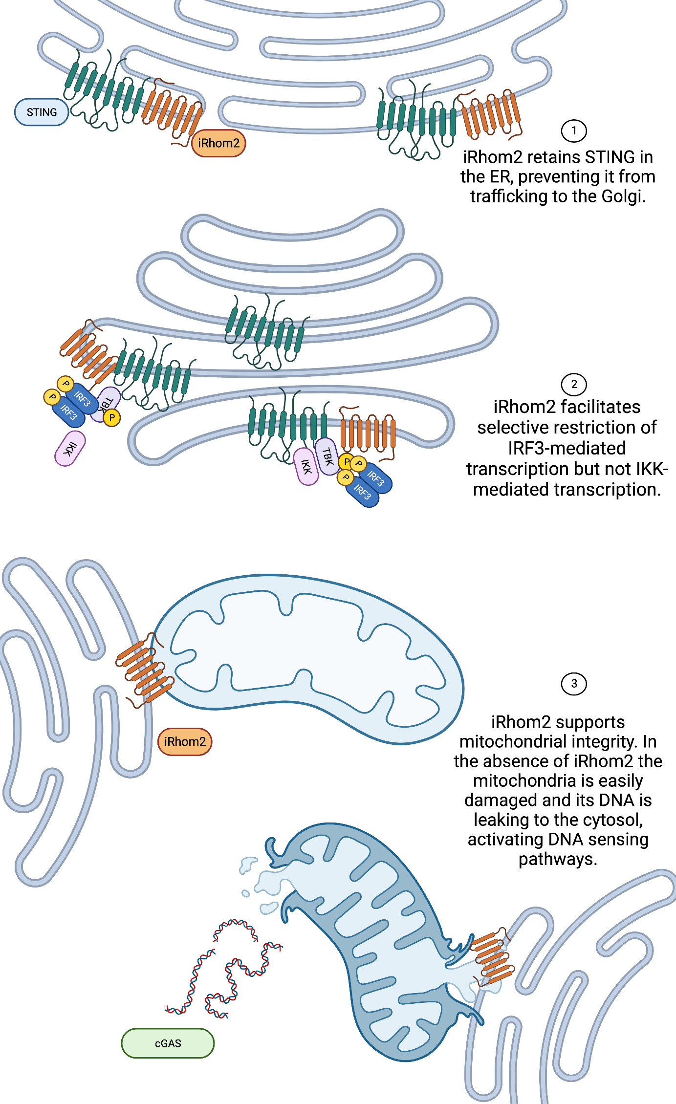 My approach to understanding how iRhom2 is operating in the cells was to use existing knowledge on the cell's response to viral infection to design experiments, without preexisting assumptions on what iRhom2 might be doing in this context. My results demonstrate that iRhom2 is acting before the massive production of the key protein interferon-beta, suggesting that iRhom2 could be involved in regulating its production. Additionally, I also saw that while the overall outcomes of inflammation and of antiviral activity happen simultaneously, iRhom2 is regulating each one of them in a different mechanism of action. I am currently working on pinpointing the exact role of iRhom2 in antiviral immunity. Specifically, what other proteins it interacts with and under what conditions.