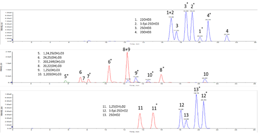 The developed LC-MS/MS methods have been applied to the analysis of samples from multiple observational studies to investigate vitamin D metabolism beyond 25-hydroxyvitamin D measurements in different population groups. A key cohort incorporated into this analysis has been samples from the Concord Health and Ageing in Men Project (CHAMP) cohort that consists of males aged over 70. This analysis has revealed important metabolism profiles of vitamin D in older men that have not previously been reported, including the measurement of circulating metabolites derived from the CYP11A1 metabolism pathway of vitamin D. Different biomarkers were linked with markers of bone health across the entire body, highlighting that 1,25-dihydroxyvitamin D3 is the most significant biomarker associated with bone health in this cohort.