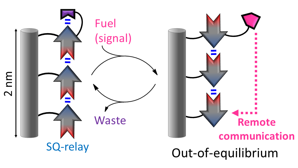 Installing a proton-responsive director in a 2 nm long SQ relay permitted multiple reversible changes in relay orientation in response to protonation/deprotonation signals. Moreover, a chemical fuel also acted as a signal, affording the first example of a molecular communication relay operating under out-of-equilibrium conditions.