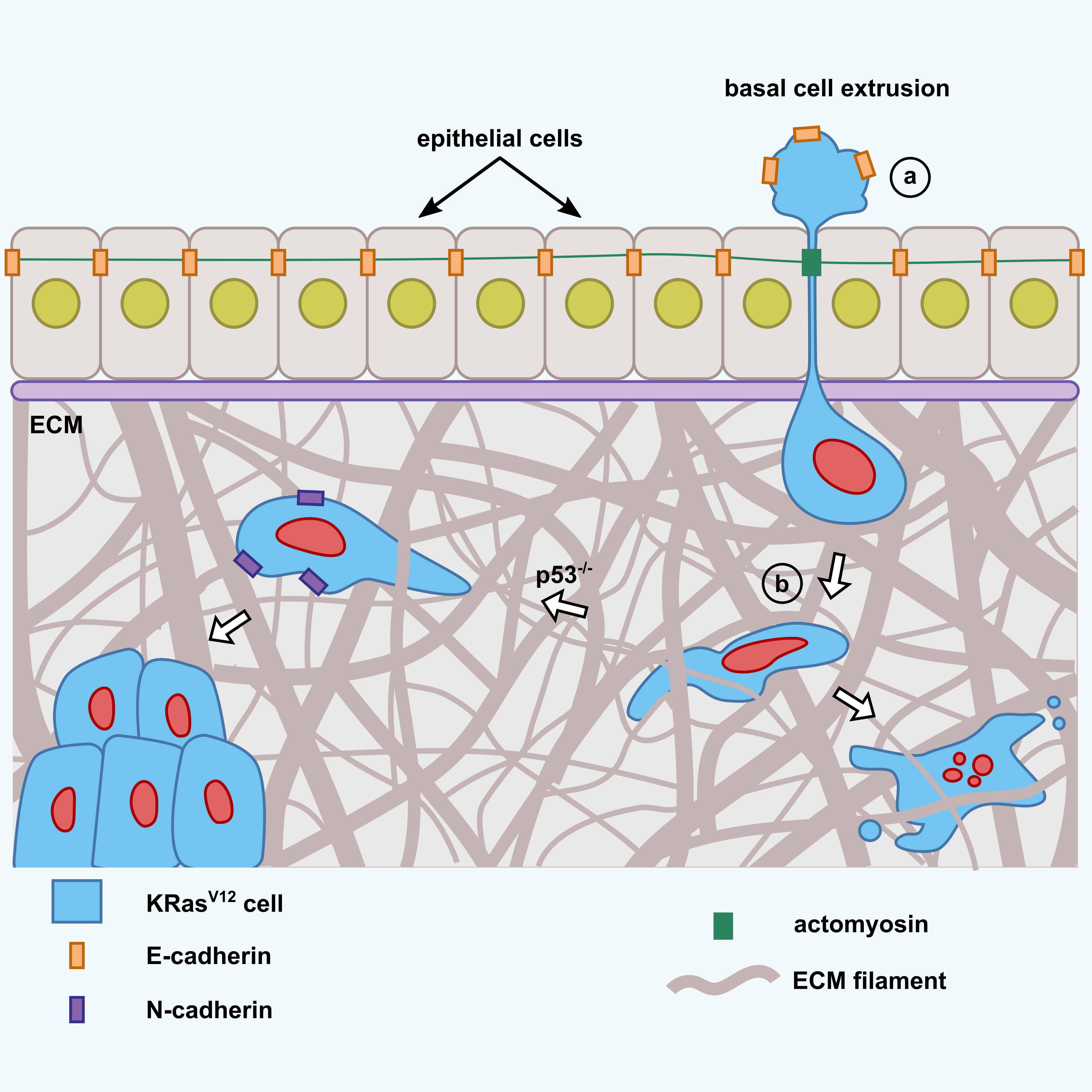 • Cancer cells invade by basal extrusion and deform as they migrate through the body. I found that as cancer cells invade by basal extrusion and migrate throughout the tight spaces inside the body, they become greatly deformed. I discovered that this confinement causes the cell nucleus, the round organelle that contains the DNA in the cell, to become compressed and elongated. These compressed cells frequently show signs of DNA damage, presumably due to the nuclear deformation, which has been previously linked to invasion in breast cancer.