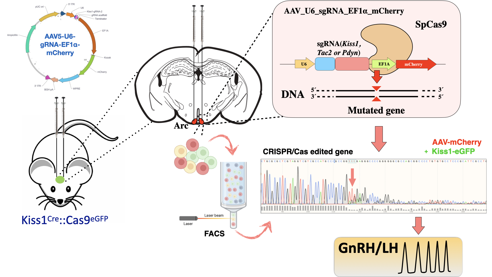 Viral particles carrying the coding sequences for CRISPR reagents were produced by external resources. Stereotaxic injections of viral vectors were performed in male and female Kiss1Cre::Cas9eGFP mice to target genes expressed in KNDy neurons, as a way to interrogate the KNDy paradigm. Cellular validation of double-strand breaks by guided Cas9 nuclease was achieved by detection of on-target indel mutations in our loci of interest by fluorescence-activated cell sorting (FACS), allowing isolation of infected Kiss1 neurons, coupled to SANGER sequencing of complementary DNA from virus-infected cells in the Arc, as chromatogram sequence analysis evidenced the presence of reading frame shifts in the coding DNA sequence of targeted genes.