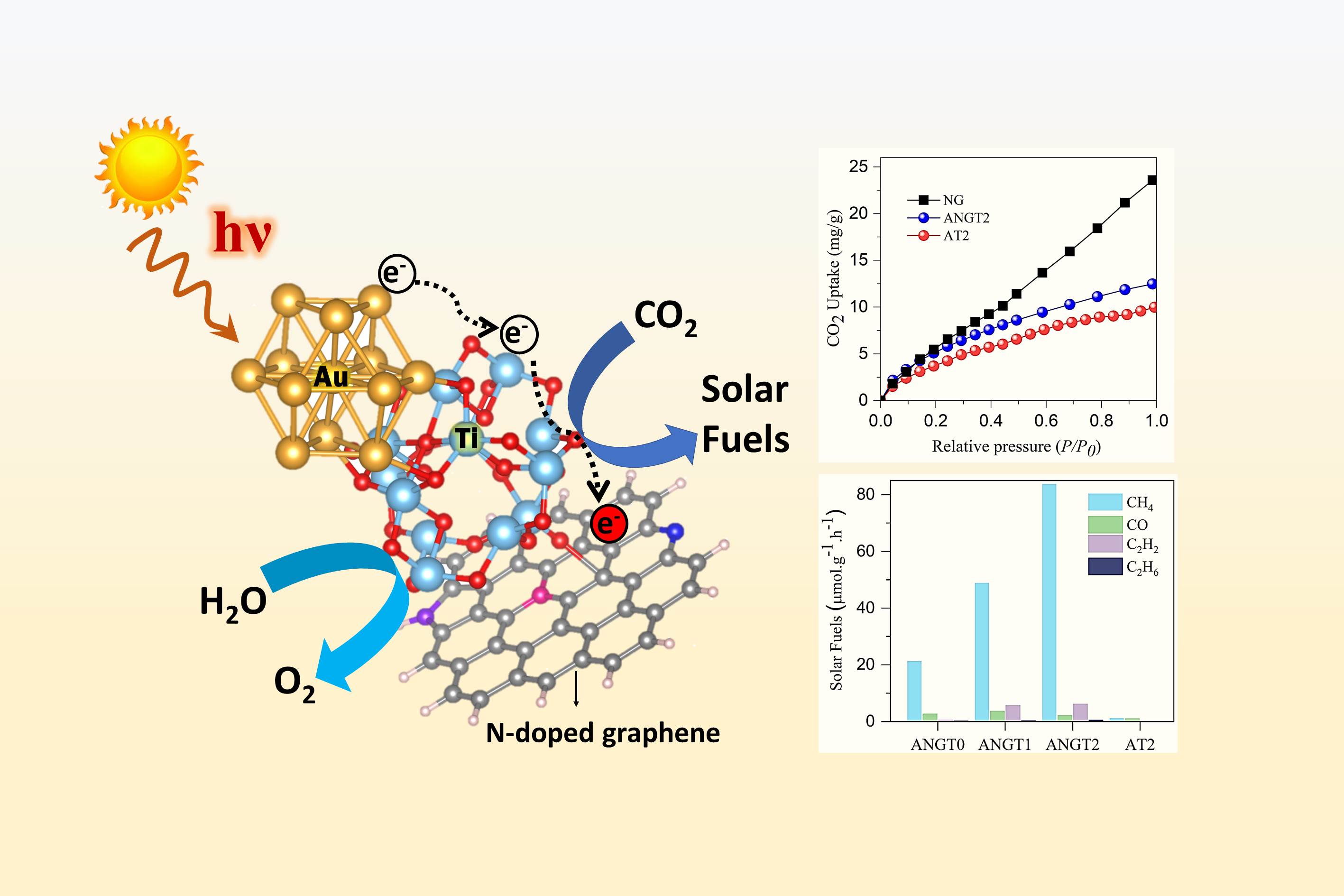 We demonstrate a series of ternary Au@TiO2 decorated N-doped graphene (ANGT-x) nanocomposite photocatalysts successfully synthesized by multistep preparation process, which exhibited significant enhancement in the photocatalytic activity toward solar fuel production with high selectivity for methane. Experimental results corroborated with theoretical DFT studies validated the unique ability quality of N-graphene playing a key role in efficiently reducing the Gibbs free energy of PCO2R reaction kinetics, increasing the binding strength of *COOH intermediate and improves the charge transfer process. In contrast to the conventionally reported binary or catalysts, the synergistic coordination in ANGT facilitated. It is deduced that N-graphene dominates the generation of CH4 in this ternary ANGT2 composite system, which should be ascribed to the unique quality of N-graphene as an excellent electron transfer mediator and adsorber for CO2. Moreover, the ANGT2 heterostructure photocatalyst exhibited the highest Relectron of 742.39 µmol g-1 h-1 for PCO2R under visible light irradiation with favorable cycling stability. The Relectron achieved here is 4 times higher than that of ANGT0 and 60 times higher than of binary AT2. The illustrated mechanism and the enhanced photocatalytic efficiency of ternary ANGT-x nanocomposites paves way for the development of future ternary hybrid solar fuel photocatalysts based on NG.