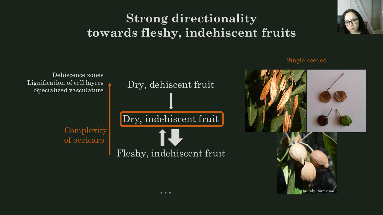 Using the updated phylogenetic framework and a database of fruit types, we showed that the ancestral state for fruit type in Oleaceae is a dry, dehiscent fruit (i.e. a dry fruit that opens when mature). We also found that several transitions towards fleshy, indehiscent fruits happened throughout the family's evolutionary history. Further, we showed that the intermediate state between a dry, dehiscent fruit, and a fleshy, indehiscent one, is a dry, indehiscent fruit. This means that anatomically-speaking, fruits first change their dehiscence (from dehiscent to indehiscent), and then change the state of their fruit wall (from dry to fleshy).