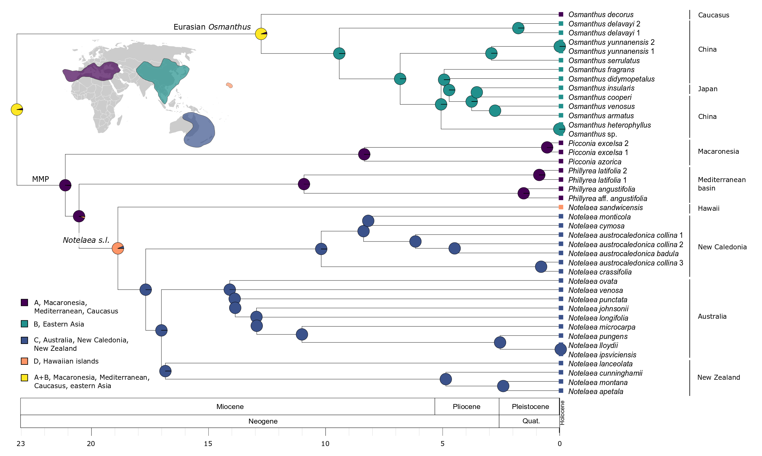Finally, the biogeography of some Oleaceae’s clades is very complex, with groups succeeding to reach far-away regions in the world. For instance, we showed that species of the Notelaea clade are distributed today in very segregated parts of the world as Australasia, the Hawaiian Islands, Macaronesia, and the Mediterranean Region. This group originated most likely in Eurasia during the Early Miocene, and to reach some of the farther regions they most likely had birds as dispersers for their fleshy fruits.