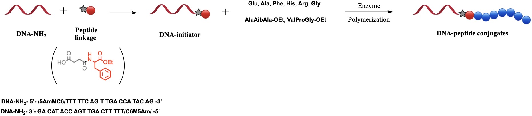 The resulting DNA-initiator was reacted with different amino acids. Alanine, glycine, histidine, lysine phenylalanine, and arginine were used for the chemoenzymatic reactions. Tripeptides [(Valine-Proline-Glycine) and Alanine-Aminoisobutyric acid-Alanine)] were also used for the enzymatic reactions. The rates of the reaction were measured using plate reader.The reactions mixtures of enzymatic reactions were used to study emergent assembly formation by AFM, DLS, and SEM.