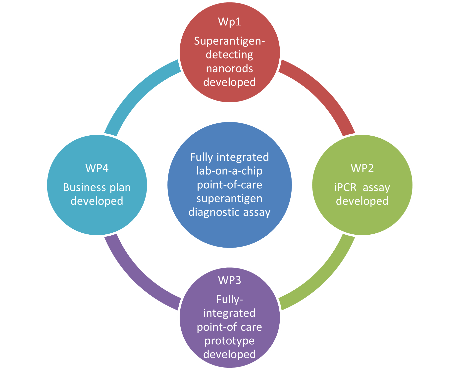 To overcome the limitations of current diagnostic assays for sepsis in the terms of sensitivity, speed and ease of use, we propose to produce a fully integrated system for highly sensitive detection of superantigens. Major increase in sensitivity will be achieved by using immune-PCR (iPCR), a method that combines immune detection of proteins with sensitivity of quantitative PCR, while the ease of use and speed are based on the microfluidic assay design. Our fully integrated lab-on-chip point-of-care device will have several advantages over the existing systems. Firstly, it will use, as detector particles, Experienced Researcher (ER)-developed DNA-protein nanorods displaying TCR Vβ. The protein-DNA link in these detector particles is essential for iPCR and it is achieved by natural production of the particles, rather than more expensive chemical coupling. Secondly, the assay will use immobilised MHC II to capture the superantigen-nanorod complex. Given that all superantigens bind MHC II, this approach will allow capture of all superantigen-nanorod complexes. The assay will allow specific detection of each superantigen by using, for superantigen-specific detection, a mixture of bar-coded nanorods, each displaying a TCR Vβ domain which preferentially binds a specific superantigen. The bar-coding of the nanorod DNA will in turn permit multiplexing of the assay at the PCR stage.