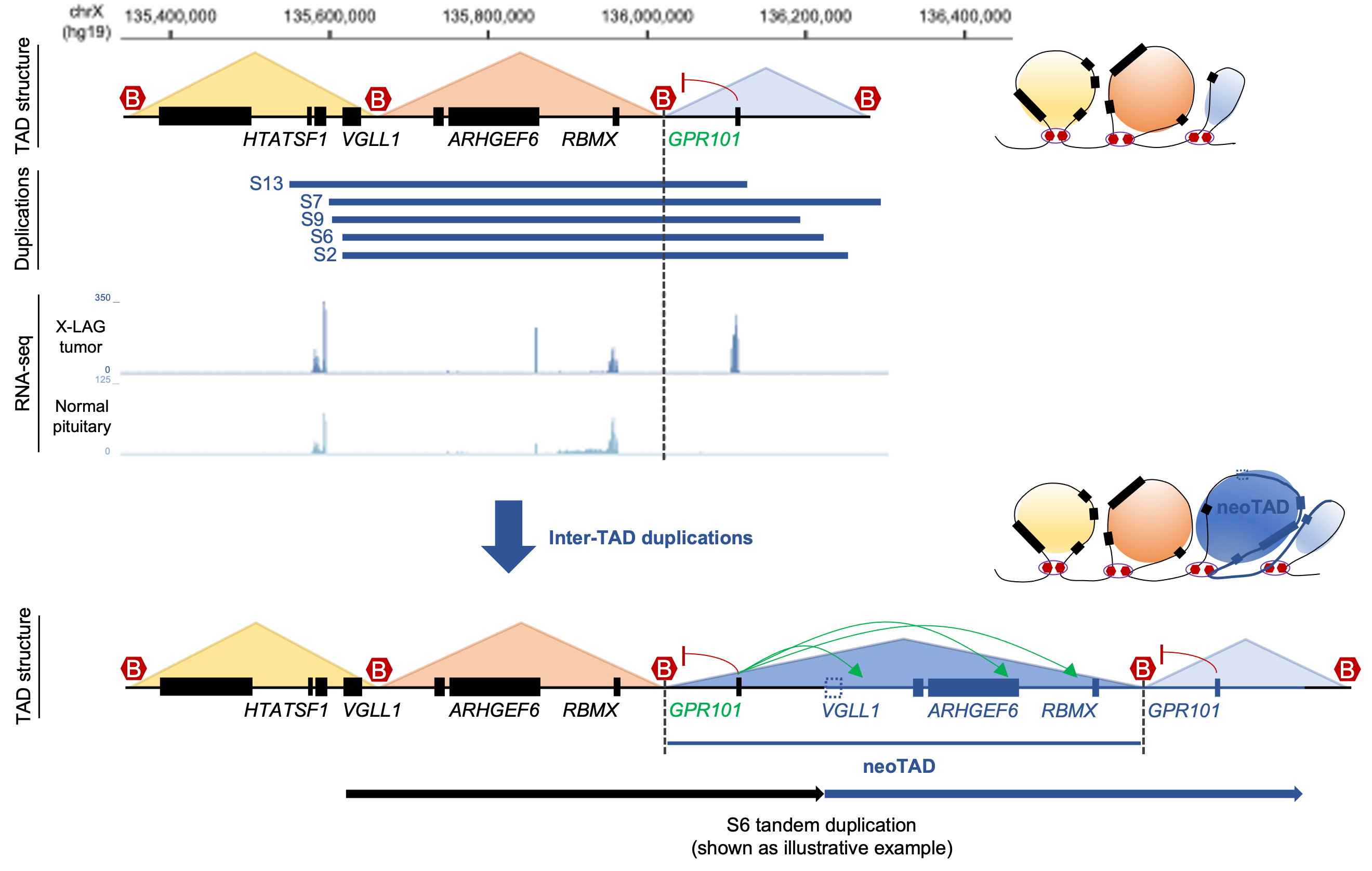 My results identified X-LAG as a new TADopathy; to my knowledge this is the first TADopathy to be described in endocrinology. Xq26.3 duplications disrupt the local chromatin architecture by forming a neo-TAD and this rewiring of GPR101-enhancer interaction causes the marked over-expression of GPR101 in X-LAG pituitary tumors, which in turn drives tumoral GH hypersecretion and gigantism in affected children.