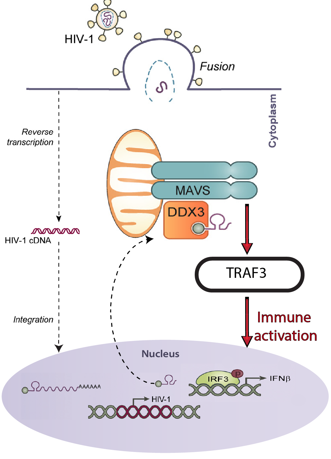 The mitochondrial antiviral signalling (MAVS) adaptor protein is a central signalling hub for host cells to mount an antiviral response following RNA virus infections, which is initiated by the cytosolic receptors that trigger the type-I interferon (INFs) path through the MAVS (Fig1). It has recently been shown that the RNA helicase DDX3 is a novel atypical member of the viral cytosolic receptor pool. It is required to activate the MAVS during the antiviral response. It is currently unknown how the complex partners MAVS-DDX3-viral RNA (MDR) interact for assembly and what is the MDR mechanism of action at the molecular level. Notably, silencing DDX3 or MAVS expression suppress activation of the native immune response, an event that in the physiological condition is at the front line of host defences against RNA viruses such HIV-1. However, understanding how viral RNA triggers the innate immune reaction requires the MDR structure elucidation. Moreover, these findings will exploit MDR molecular features to create a new generation of adjuvants in anti-retroviral therapy.