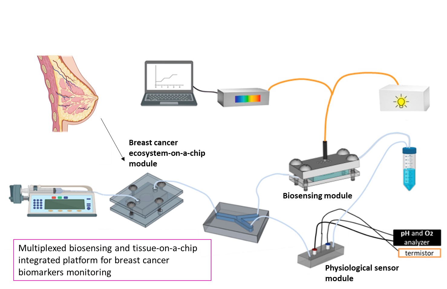 In this regard, this project aims to develop a multimodular platform including a (breast cancer ecosystem) BCE-on-a-chip (perfused bioreactor containing an organoid) module connected to a label-free biosensor for continuous monitoring of cell-secreted biomarkers.