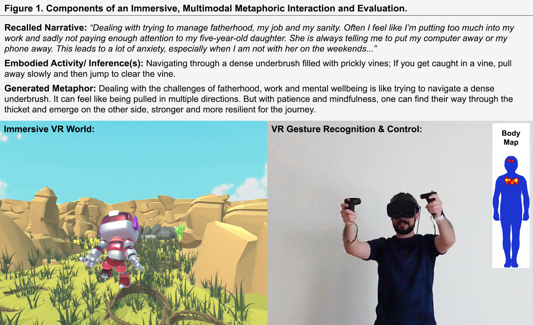 1. Metaphor & Stories: (1) Identify metaphors/ CMs and verb phrases associated with embodied knowledge of CMs including by leveraging LLMs, also iconic gestures; (2) Establish embodied event narration task(s) including asking users to narrate memorable/ emotional events and explore prototyping IMMIs to reflect on the situation described in the narrative.