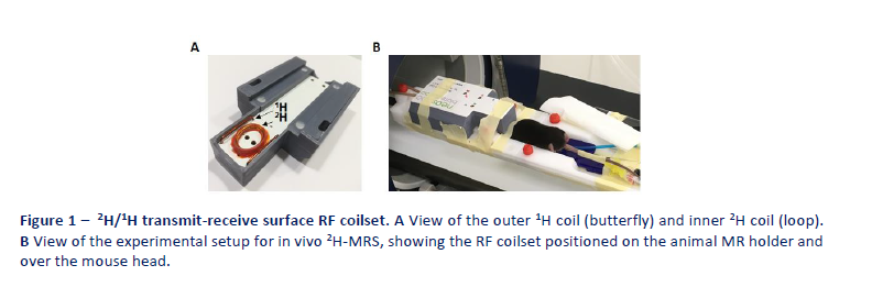 For this we initially tested several pulse sequences, which performed generally well in vitro but not in vivo in the mouse brain for the purposed of CHyMERA (SECSI, PRESS-CSI, LASER-CSI, EPSI, and CEST). These problems were circumvented with deuterium magnetic resonance spectroscopy (DMRS), a novel magnetic resonance modality based on injection of non-toxic deuterated glucose. Therefore, we contacted NeosBiotec to design a custom-made radiofrequency coilset for the mouse brain (Fig 1).