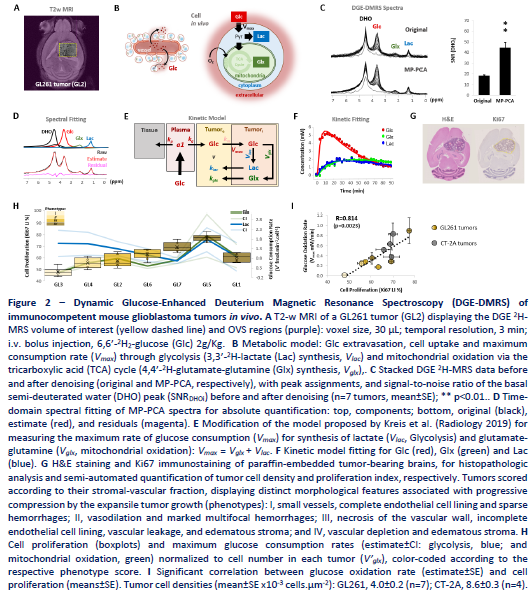 Then, we successfully harnessed DMRS with volume localization and spectral denoising to perform dynamic glucose-enhanced (DGE) experiments in mouse brain tumors at 9.4 Tesla with unprecedented voxel resolution (15-35 mm3, Fig 2 A-C). This enabled the quantification of simultaneous glucose flux through glycolysis and mitochondrial oxidation in a well-established, immunocompetent mouse model of glioblastoma (GL261) in vivo (Fig 2 D-H). Importantly, we detected a strong correlation between glucose oxidation rate and cell proliferation in a relatively small, non-gender biased tumor population, presenting heterogeneous vascular-stromal phenotypes (R=0.829 p=0.021) which is consistent with additional results on a another immunocompetent GBM model with homogeneous phenotypes, CT-2A (cell line obtained from Dr. Thomas Seyfried) – Fig 2 I. The methodology is also being applied to a third GBM mouse model, in this case the conditional model Pten;P15/16b;EGFRvIII (obtained from Dr. Olaf van Tellingen), therefore addressing the main objective of CHyMERA – developing a non-invasive methodology to assess tumor proliferation in mouse models of glioblastoma.