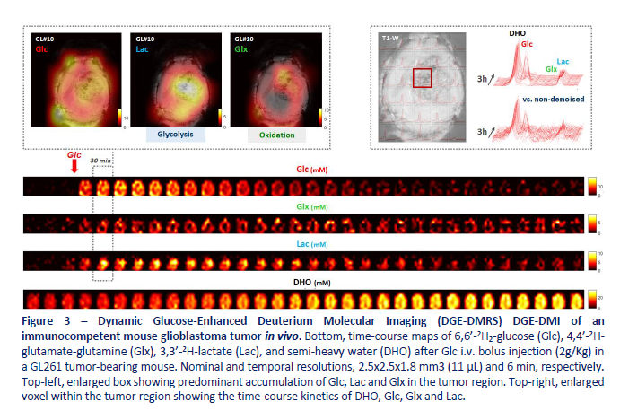 We are also exploring ways to extend DGE-DMRS to map glycolytic and oxidative rates of glucose metabolism within the GBM microenvironment, using deuterium molecular imaging (DGE-DMI, Fig 3). This is particularly challenging for the latter, which were talking with new methods for spectral denoising. This will enable us to address another important aim of CHyMERA – to provide hotspot images of tumor proliferation.