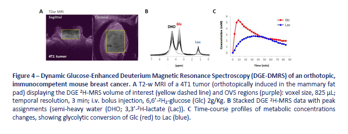 Finally, we have successfully tested DGE-DMRS on an orthotopic, immunocompetent mouse model of metastatic breast cancer (4T1), also proposed in CHyMERA. Our preliminary results confirm the ability to measure the glycolytic turnover of glucose in these tumors (Fig 4), and thus the feasibility to pursue the final aim of the project: imaging the metastatic potential of breast cancer. However, since our current deuterium RF coilset is custom-made for the mouse brain, and therefore suboptimal for breast tumors, we will need a new coil design to continue with these studies. The same applies to the tissue perfusion studies initially proposed at 16.4 Tesla, for which we would also need an additional preamplifier for deuterium.
