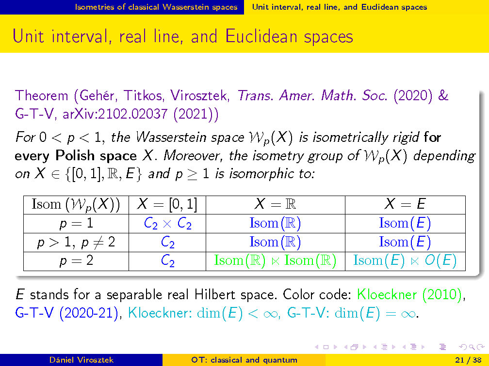 Our main objective concerning OT was the study of the metric structure of classical Wasserstein spaces with a strong emphasis on the classification of distance-preserving maps.