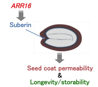 Among the components of the seed coat known to affect permeability, suberin, a lipid and phenolic cell wall heteropolymer, is mainly accumulated in the hilum region of the seed coat and acts as a water-repellant. It was found that arr16 mutant seeds showed more suberin-related autofluorescence (AF) than those of wild type (WT) under UV light. Additionally, GWAS based on hilum AF measured by image analysis was performed and resulting SNPs associated with hilum AF level were compared with those associated with seed coat permeability. Interestingly, the 10 significantly associated SNPs located in the promoter of ARR16 were common to both traits. This suggests that ARR16 regulates the variation of permeability in natural accessions, at least partially, by affecting suberin deposition in the hilum. Analysis of seeds for lipid polyester monomer composition revealed that certain dicarboxylic acids (DCAs) and phenolics were accumulated to significantly higher levels in arr16 compared to WT.