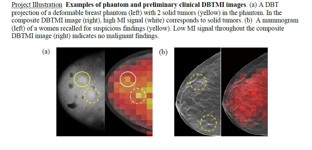 WP4-5 focused on the evaluation and optimization of the DBT prototype, both preclinically and in pilot clinical tests. Preclinical evaluation (WP4) has used simulations/VCTs and physical breast phantoms. For VCTs of DBTMI, we developed a method to simulate the MI acquisition. We also developed methods to select the population of virtual patients, and a model of tumor growth, to simulate multiple years of breast screening. Simulation work was performed by Master students mentored by Dr Bakic and published in a journal paper (2 more in review) and several conference papers. Phantom evaluation has used radiographic undeformable phantoms and a multimodality deformable breast phantom. Undeformable phantoms were used to analyze sensor artifacts. Deformable phantoms were used to test the MI acquisition and composite images of MI and DBT data. Results from phantom studies were presented in various conference papers and grant funding applications. An example of a DBTMI composite image of a deformable phantom is shown in Project Illustration.
