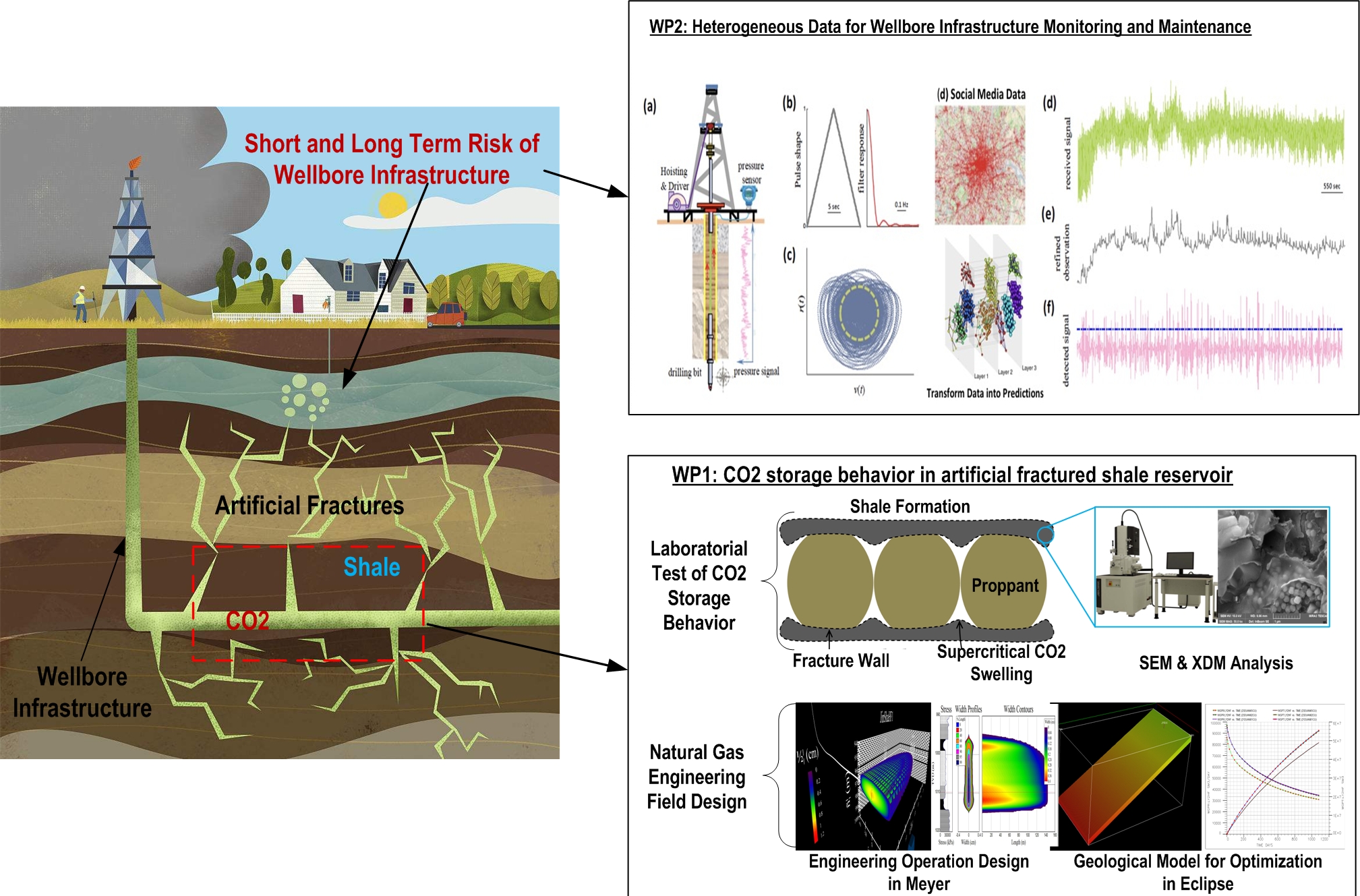The current best practice for gas exploitation is the massive hydraulic fracturing technic. These controversies and protests never stop causing environmental and societal issues, e.g. seismicity disasters, underground pollution, freshwater consumption, gas leaks, etc. Because of all these potential hazards, many countries like Germany and France have legally prohibited hydraulic fracturing, and as a result, the shale gas revolution was nearly stifled in the cradle. For a single typical shale gas well, more than 30000 tons of fresh water, and around 150 tons of chemicals as well, will be injected into the target formation. The consumption of fresh water is unrecyclable. The injected chemicals are nondegradable including acid, heavy metal ion, high-molecular polymer, etc. Their underground pollution behaviour is still unknown in the short and long term. The influenced area is approximately 3 million sq. ft (600 ft fracture length multiply 5000 ft horizontal well) for a single well and will become larger and larger in long term along with the geological migration. Only new technics, especially which are environmentally friendly, are encouraged by the government and public so to promote shale gas exploitation. The pure CO2 fracturing technic is one of the most ideal and feasible technics replacing the traditional water-based technic. No water and chemicals are involved. Especially, this technic will be upgraded by integrating with Carbon Capture, Utilization, and Storage (CCUS) during this project, which benefits carbon emission reduction. This new technic will solve most of the pollution problems except the infrastructure degradation, causing gas leaking, which will aggravate global warming more seriously than CO2 does. The wellbore infrastructure issue is an unnoticeable but severe issue after fracturing operation, long-term production (leading to in-situ stress redistribution) and geological activities. Not enough attention is paid, fewer researches are carried out and no monitoring method is adopted. Fortunately, we are entering the time that sufficient data have been collected over the past few decades. Structural Health Monitoring (SHM) leverages proprietary sensors to infer knowledge on structural conditions that have been identified and shown to have several promising features, including the identification of critical zones. By using remote senescing data (Earth Observation), topological data (OpenStreetMap), crowd data (social media and mobile) as well as localized sensor data, with data mining techniques, in fact, regional scale geological conditions, as well as potentially affected areas, could be observed and monitored, timely intervention can be taken place to minimize the damages. Therefore, environmental-friendly technics and a monitoring system are urgently needed in order to explore shale gas and fully utilize it to its maximum potential. Several fundamental challenges exist in current research.