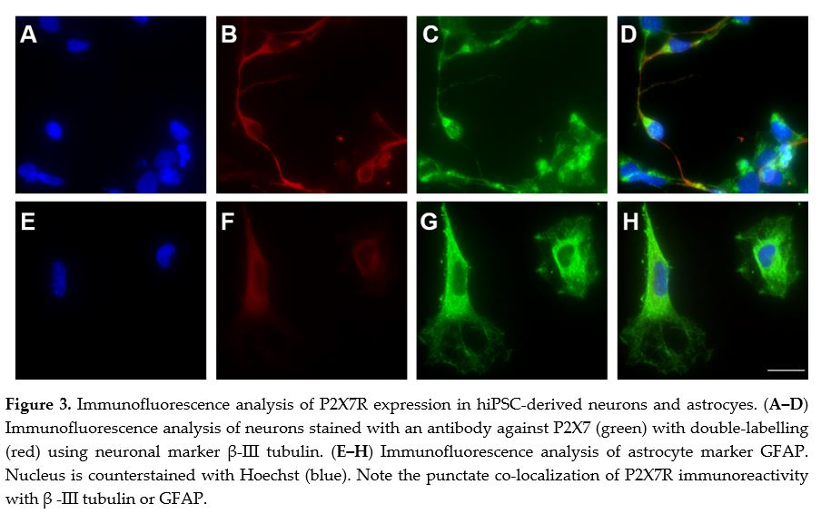 To investigate if P2X7Rs are expressed in hiPSC-derived neurons, immunohistochemistry was performed on neurons and astrocytes. In double labelling experiments using the neuronal marker β-III tubulin and P2X7-specific affinity purified antibody, expression of P2X7Rs was evident by a punctate staining pattern. Likewise, to assess the expression of P2X7Rs on hiPSC-derived astrocytes, double immunostaining was performed on astrocytes at 4 weeks in vitro using antibodies against the astrocyte marker GFAP and P2X7 (Figure 3).