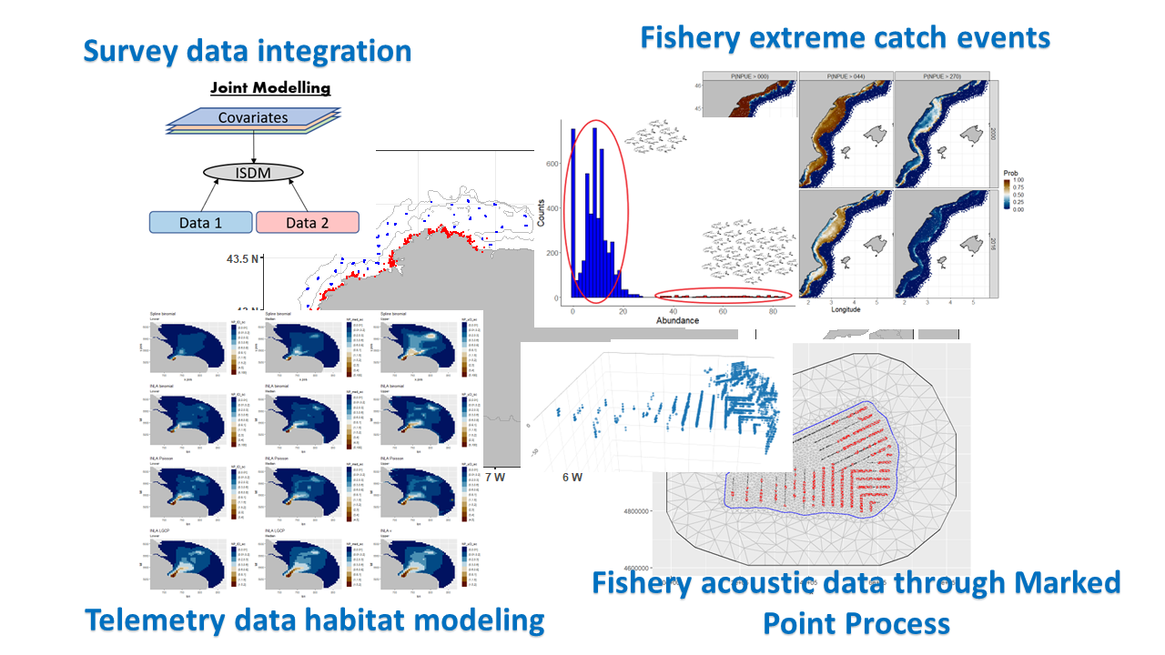 1) Data integration of fishery surveys allows us to use opportunisticaly collected data to balance unexpected gaps in scientific survey data. These gaps can be either spatial, temporal and, under certain assumptions, even spatiotemporal gaps, that generaly occur due to financial problems, bad weather, covid, etc. This research line may have a profound economic impact in the future of fishery data collection as we may be able to reduce the costs of data collection by a large amount. This may be particularly relevant in case of financial problems or the need of collecting more fishery data for management purposes.