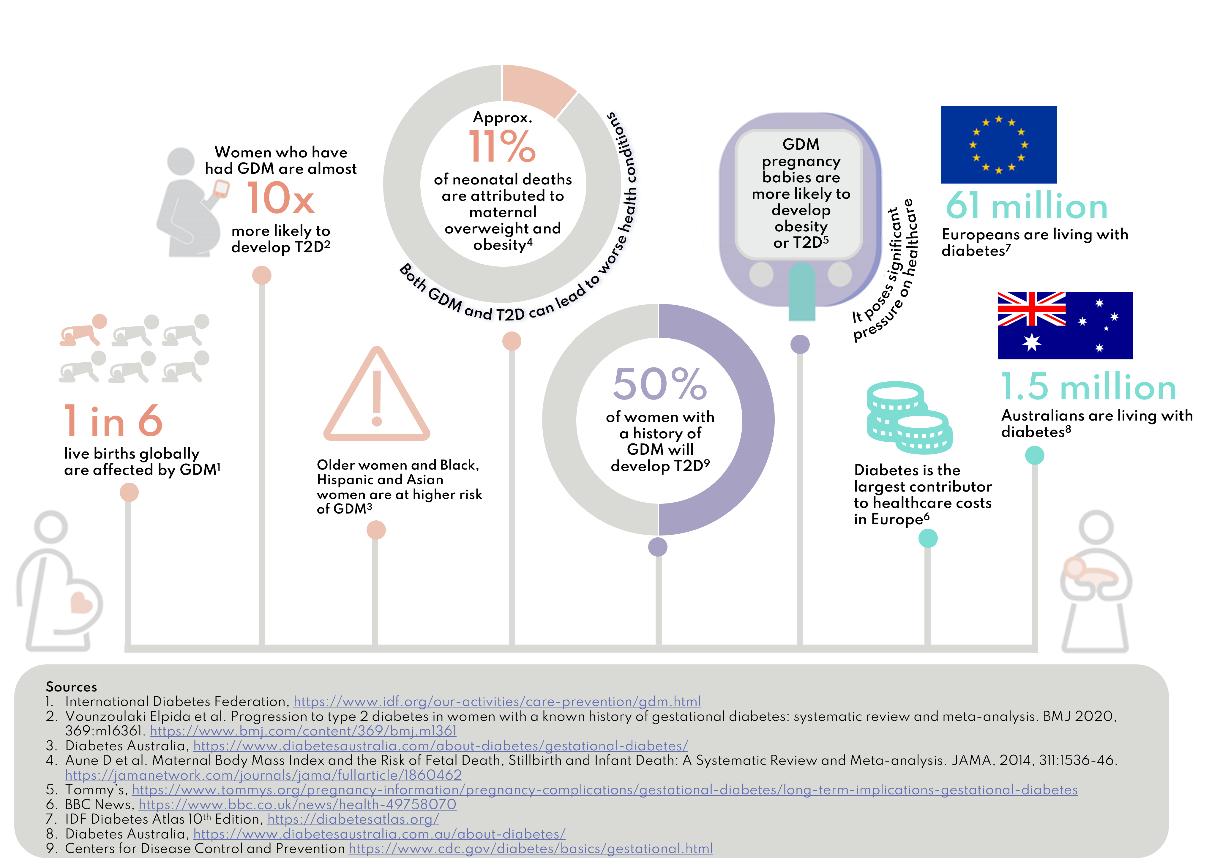 ● Reduce GDM-associated risk (e.g. birth complications, stillbirth, maternal morbidity such as hypertensive complications of pre-eclampsia and eclampsia, caesarean section, mortality)