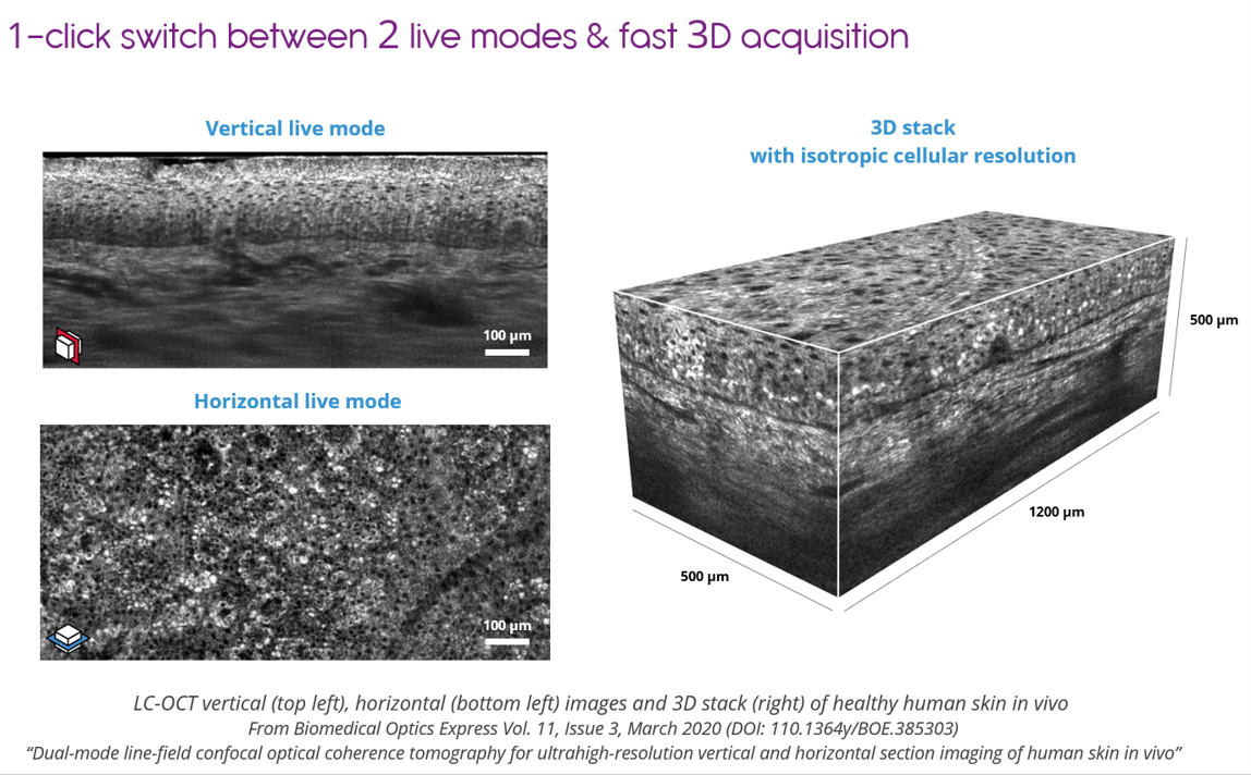 deepLive™ is a Class I medical device according to the directive EC 93/42/CEE and is indicated for the imaging and characterization of multiple skin conditions in human adults. With the combination of 3 imaging modes – vertical, horizontal, and 3D – deepLive™ enables the dermatologist to visualize the epidermis and dermis in real-time; and get a better understanding of skin pathologies at the cellular level, thus accelerating their management, and facilitating access to non-invasive diagnostics and treatments.