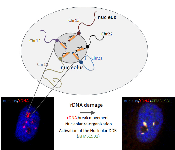 (1) Understand how the nucleolar DNA damage response is organised. To maintain genomic stability and avoid cancer transformation cells have evolved a complex signalling network of sensor, adaptor and effector proteins that mediate DSB repair. Given the unique characteristics and the biophysical properties of the nucleolus, emerging evidence highlight that the nucleolar DNA damage response has unique features including break movement to the nucleolar exterior, transcriptional shut down and dedicated adaptor proteins that facilitate rDNA break repair. Our aim is to identify novel regulators of the nucleolar DNA damage response and unravel how the response is organised in space and time.