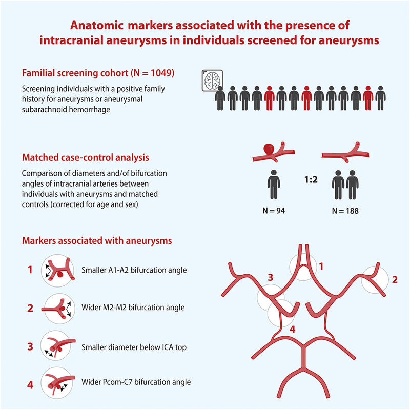 We developed a semi-automated tool to measure the diameters, configurations, and angles of intracranial arteries. Using this tool, we identified several vessel characteristics associated with IA development (also see image imaging markers attached).