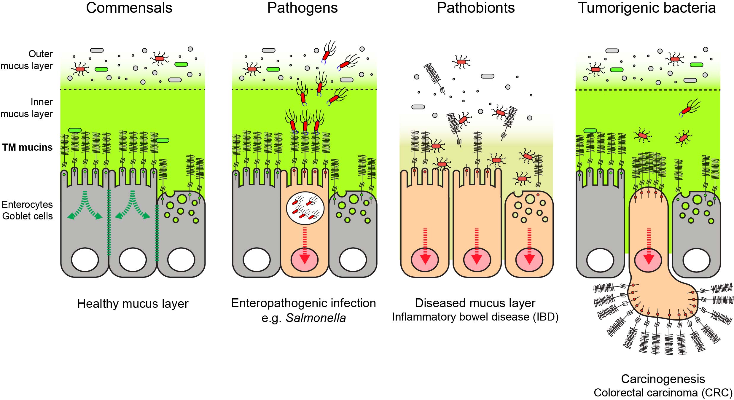 We discovered that mucins play essential roles in maintaining intestinal health and that bacteria-mucin interactions are highly specific. Pathogens such as Salmonella have developed specific virulence factors to hijack mucins for invasion. The giant adhesin SiiE of Salmonella interacts with sialic acid-containing sugars on MUC1 and this interaction allows the bacteria to invade at the apical surface of the intestinal epithelium. We also discovered that the transmembrane mucin MUC13 is an important regulator of intestinal barrier function. The mucin contributes to opening of tight junctions which are the selective "gates" that regulate the uptake of nutrients and at the same time preventing bacterial invasion. Commensal bacteria such as Bifidobacteria colonize the mucus layer and cleave off mucin sugars for nutrition. We demonstrated that probiotic Bifidobacterium efficiently remove sugars from MUC13 and at the same time strengthens intestinal barrier functions, an example of a symbiotic relationship between commensals and host.