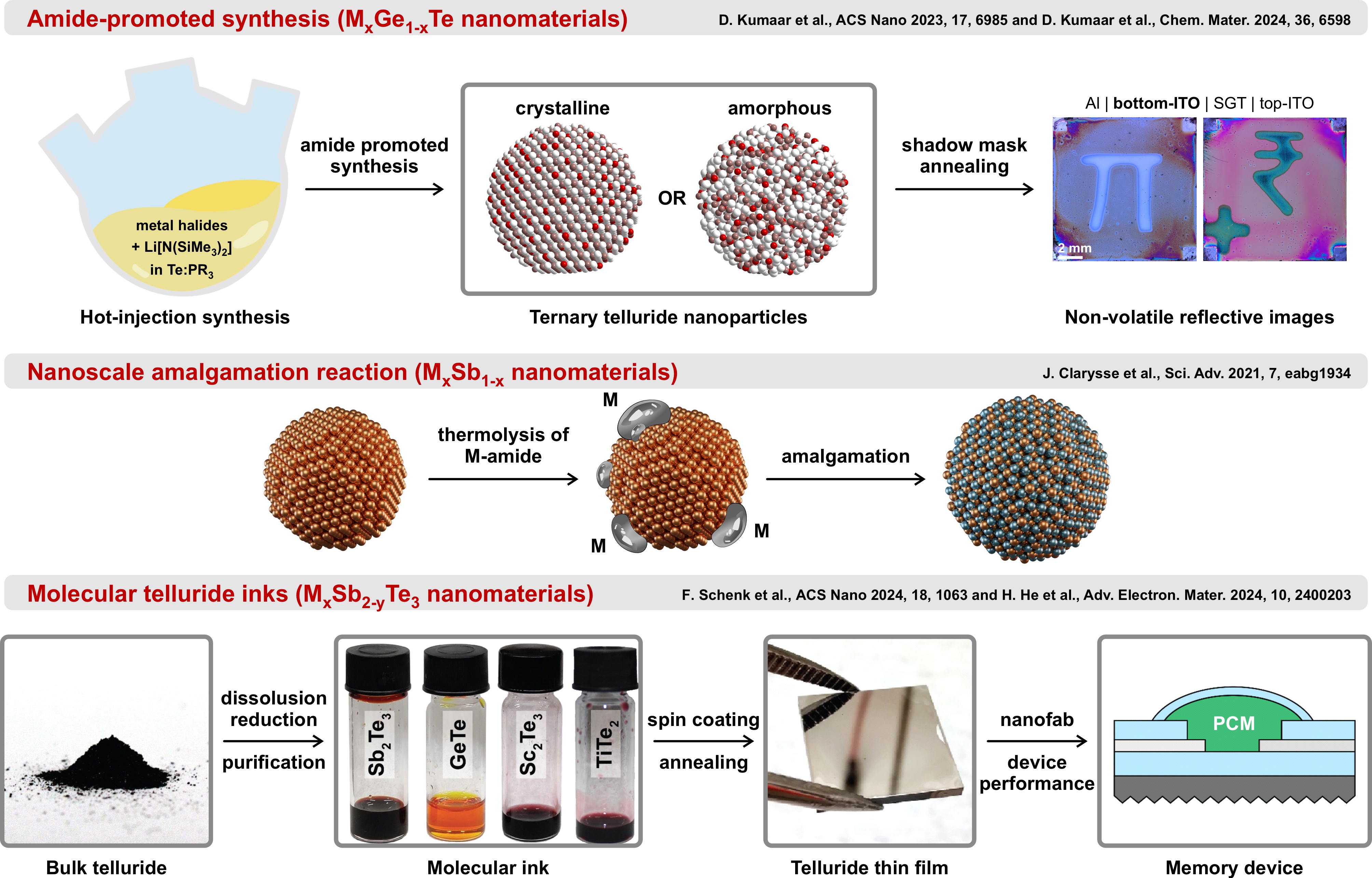 For the chemistry-related tasks, we have synthesized a large range of ternary tellurides and antimony-rich alloyed nanoparticles. We have achieved all planned compositions of nanoparticles, spanning from classical Ge-Sb-Te (GST) material to the most recent ternary telluride systems (i.e. Sn-Ge-Te or Cu-Ge-Te) and antimony-based bimetallic nanocrystals (i.e. Bi-Sb). For many of these materials, we demonstrate a total control over size, composition, and phase of nanoparticles. In addition, we develop a solution-based approach for molecular ternary tellurides, reaching an accurate composition control and high-quality homogeneous thin films from these molecular inks. Taken together, we have developed means to prepare literally any phase-change material in the form of liquid formulations.