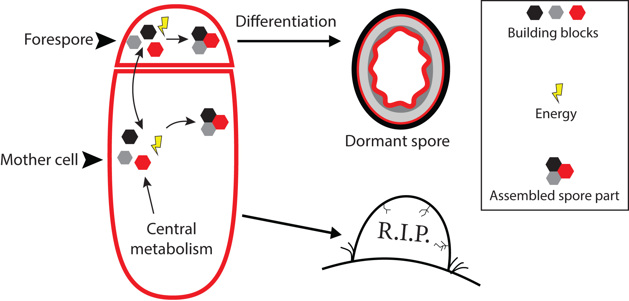 Bacteria provide terrific systems for studying the interplay between housekeeping metabolism and differentiation. They have streamlined and easily manipulated cellular machineries and a minimal number of essential genes. Many bacterial species embark upon relatively simple differentiation processes that culminate in the formation of specific cell types. In this project, we aim to provide a comprehensive analysis of the role of housekeeping metabolism during endospore formation in the bacterium Bacillus subtilis. Sporulation is a simple differentiation process that entails the interaction between two cells arising from a single cell division: the forespore, which becomes a metabolically dormant spore that is virtually immortal, and the mother cell, which dies after sporulation. We have developed a system to eliminate specific housekeeping machineries in only the mother cell or the forespore during sporulation. This system enables us to define which housekeeping functions are important during sporulation, and in which cell. We are using this system, in combination with a variety of cutting-edge technologies, to obtain a detailed understanding of the role of housekeeping metabolism in sporulation. We expect that our results will provide insights into the metabolic processes that underpin cellular differentiation.