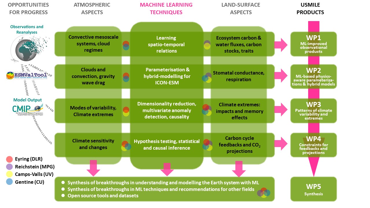 More specifically, in WP1, we developed machine learning techniques to enhance satellite products and improve understanding of atmospheric and terrestrial interactions, leading to advancements in cloud classification, climatology, and carbon and water flux representation. In WP2 our work on hybrid ML-physical modeling resulted in improved parameterizations for the ICON model, advancements in land process modeling, and the creation of the DifferLand hybrid model for complex land relationships. In WP3 we developed ML techniques to detect and understand climate variability and extreme events. In WP4 we enhanced causal model evaluation, analyzed teleconnections and used ML-based products to constrain drying trends. In WP5, the USMILE PIs published two high-level Perspectives on ML’s role in climate modeling and analysis, advocating for hybrid Earth system models to improve model accuracy and projections also for extreme events, highlighting AI's significance in enhancing climate models and information for mitigation and adaptation.
