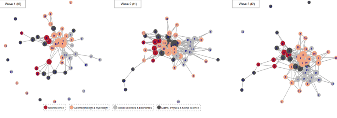 We took the opportunity to explore how an innovative training network can create transdisciplinary capacity, via the work of an ESR, who studied the evolution of the i-CONN network. Through this longitudinal study, we have been able to reflect on the effectiveness and inclusiveness of collaborations and evaluate the types of interactions that help to facilitate knowledge exchange and learning between network members (Fig 3).
