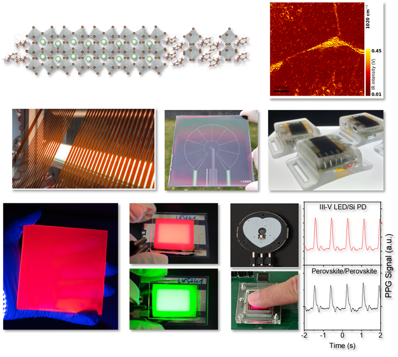 PeroCUBE evaluated the potential of metal halide perovskite semiconductors for photovoltaics (PV), light-emitting diodes (LEDs), and light-fidelity (LiFi)/visible light communication (VLC). To this end, atomic-scale simulations and perovskite ink engineering experiments were conducted to identify the most promising perovskite materials, including 2D/3D heterostructures. The performance of these materials was validated by processing small-area PV and LED devices using laboratory-scale deposition methods. Small-area solar cells achieved an efficiency greater than 23%, while small red, green and blue LEDs achieved external quantum efficiencies greater than 20%, 20% and 10%, respectively. The most promising layers for PV and LED devices were then scaled up to larger dimensions, initially to 1 cm² and subsequently to greater than 50 cm². For this purpose, we used sheet-to-sheet (S2S) processes for rigid substrates and roll-to-roll (R2R) methods for flexible substrates. Devices were then encapsulated using optimized packaging stacks to ensure long-term stability, particularly under damp heat conditions. Small and large-area PV and LEDs (red, green, blue) devices, whether rigid or flexible, were characterized to understand structure-property relationships. To this end, PeroCUBE developed a nanoscale characterization method featuring a novel type of dual-cavity laser made specifically for PeroCUBE, combining an interband cascade laser and a quantum cascade laser. PePV devices were evaluated as photodetectors for VLC applications before being implemented in wearable devices with indoor positioning capabilities, using lamps transmitting a unique identifier. Additionally, devices featuring small perovskite photodetectors for VLC and a larger perovskite PV module on the same substrate were demonstrated for energy-autonomous VLC systems with indoor positioning capabilities. Perovskite LEDs were also included in a multifunctional demonstrator capable of emitting light, harvesting energy from light, and sensing for LiFi, touch screens, and photoplethysmography. While perovskite LED devices showed high performance in small areas, large-area devices (50 cm²) exhibited insufficient operational lifetimes due to extrinsic defects causing rapid device shunting. To address this issue, the consortium adopted an alternative approach: the light emitted by blue organic LEDs (OLEDs) was down-converted to red or green using perovskite phosphors. This method significantly improved operational stability and enabled the demonstration of a LiFi optical link with a perovskite LED sending coded information to a perovskite photodetector. Life cycle and human health risk assessments were performed, with results indicating a similar impact of PeroCUBE technologies compared to existing ones, and even a relative advantage for flexible perovskite PV. Overall, the project met its objectives of advancing metal halide perovskite semiconductors for photovoltaics, LEDs, and VLC by demonstrating: (i) perovskite compositions leading to high PV and LED performance, (ii) encapsulation methods for both rigid and flexible devices, with rigid encapsulation passing five times the IEC 61215 damp heat requirements, and (iii) perovskite prototypes for indoor positioning using visible light communication protocols. A number of trade secrets could be generated during the project and one patent has been filed. Concerning dissemination, more than 40 manuscripts were published in scientific journals and more than 60 presentations were given at conferences, workshops and fairs.