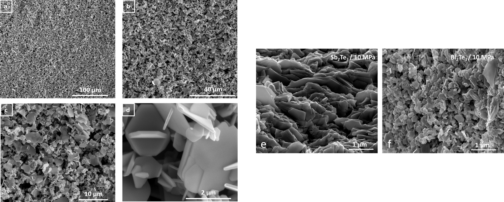 2. Fabrication of porous films with good TE properties: Different nanostructured TE materials were prepared in porous form with good TE properties. (i) Bismuth telluride alloys (both n- and p-type) were fabricated by electrophoretic deposition and solution-based routes. In addition, they were also prepared optimising cold press conditions (Fig. 2). (ii) Oxides, p-type V-doped Ca3Co4O9 and n-type Ag-doped ZnO were also obtained via hot press at reduced pressures (Fig. 3). (iii) P-type PEDOT:PSS films were also prepared by ice-templating method (Fig. 4).