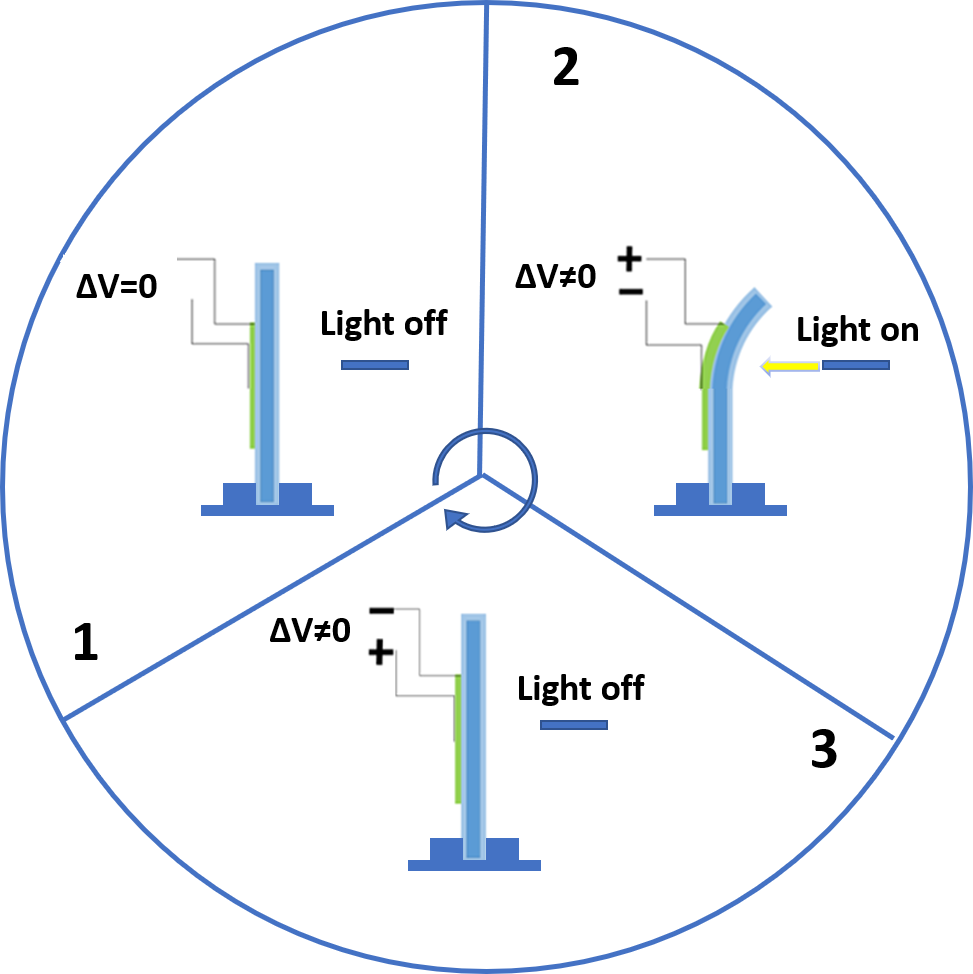 Photoenergy Harvesting Systems: To take advantage of light energy harvesting based on PMP-PZL devices, a dedicated generator topology has been proposed. This is a completely new paradigm and the most challenging with respect to the state of the art. We used an easy and effective approach to enhance the quantum yield of azobenzene and to extend its wavelength sensitivity by doping the PMP matrix with different selected materials: carbon black (CB), zinc oxide (ZnO) and silver nanoparticles of suitable shape. These doped PMP films showed faster and more significant bending under both UV as well as visible and near infrared light regardless of whether it was coherent, incoherent, polarized and unpolarized irradiation.