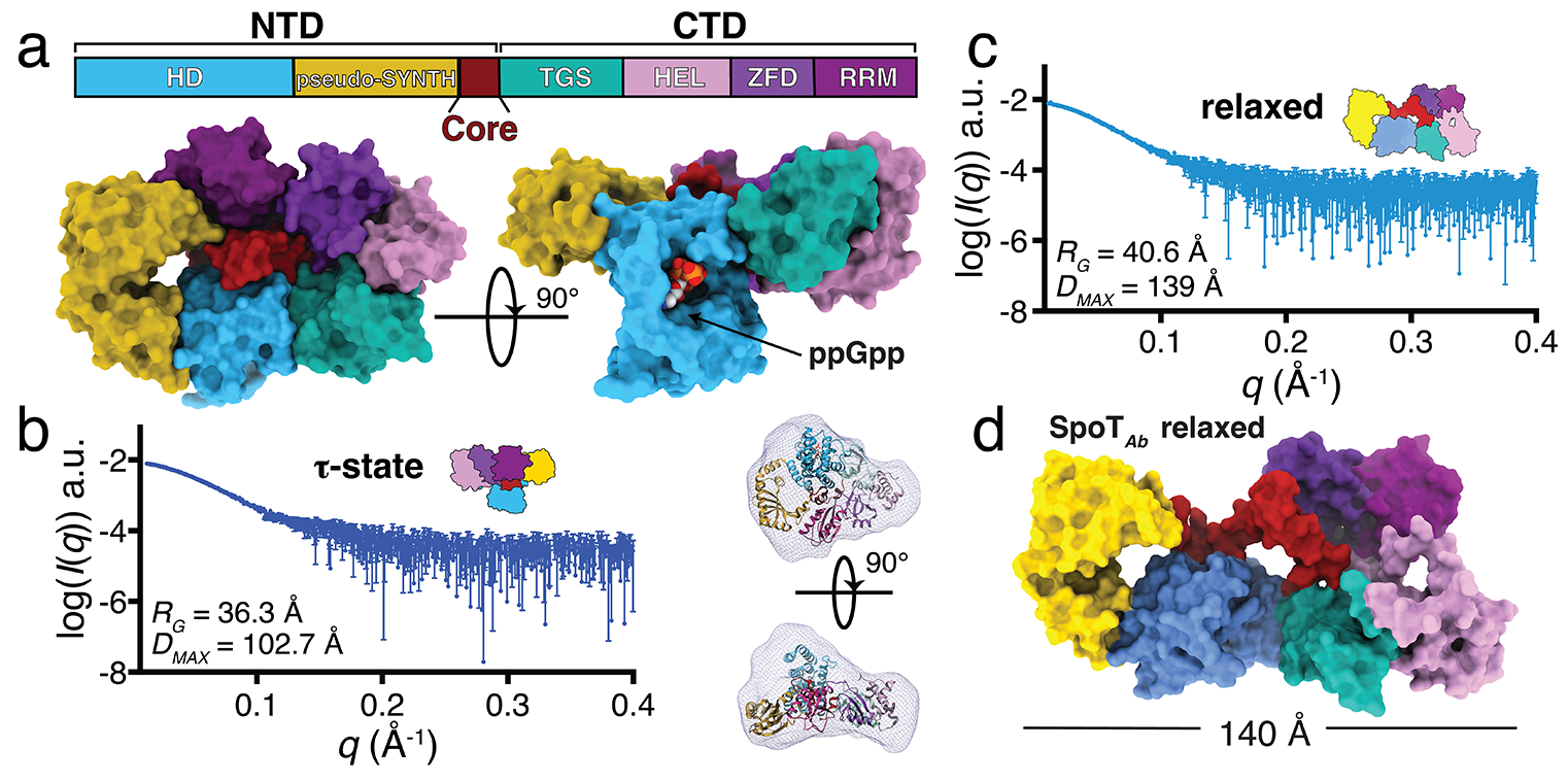 Notably, one of the outcomes of these research identified a short ‘core’ domain located in between the N-terminal catalytic domains and C-terminal regulatory domains of stringent factors that is the linchpin of the active hydrolase conformation of the enzyme and key for the switch to active synthetase states. Interestingly, the propensity for the different active states correlated with the length and disorder of the core region in of the different families of stringent factors SpoT, Rel and RelA, which could mean that genetic expansion and contraction in the core is a defining evolutionary feature of the specialisation of RSH enzymes into (p)ppGpp synthetases or hydrolases. Since RSH enzymes can sense environmental stresses to modulate stress adaptation through coordinating (p)ppGpp synthesis and hydrolysis, further determining the control of the different states would be an exciting future research direction to enhance understanding of its role in stress signalling through (p)ppGpp hydrolysis.