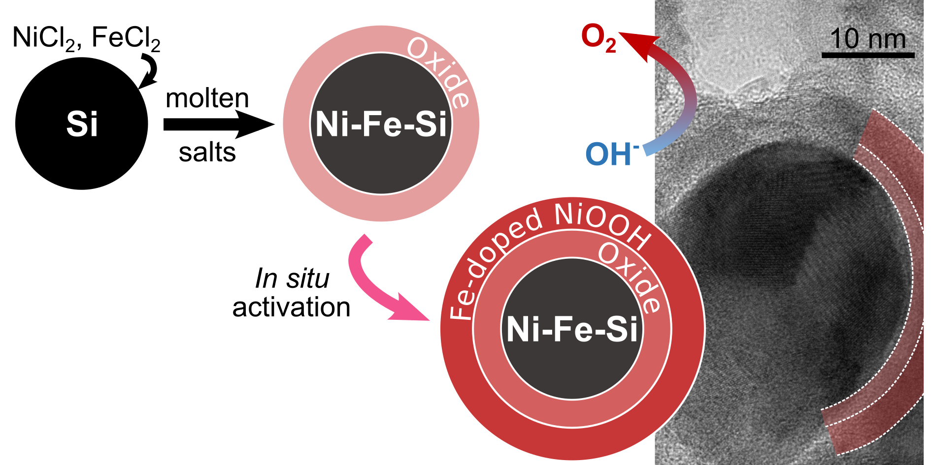 The second direction is the design of new nanomaterials. We developed a reaction pathway to discover the first iron-doped nickel silicide nanocrystals, by converting silicon nanoparticles into molten salts. In oxidative conditions, these new nanocrystals transform into heterostructures that deliver high performances for the electrocatalysis of the water oxidation reaction. We also discovered a new compound combining two anions into a new atomic framework, enabling water photoelectrolysis for hydrogen production.