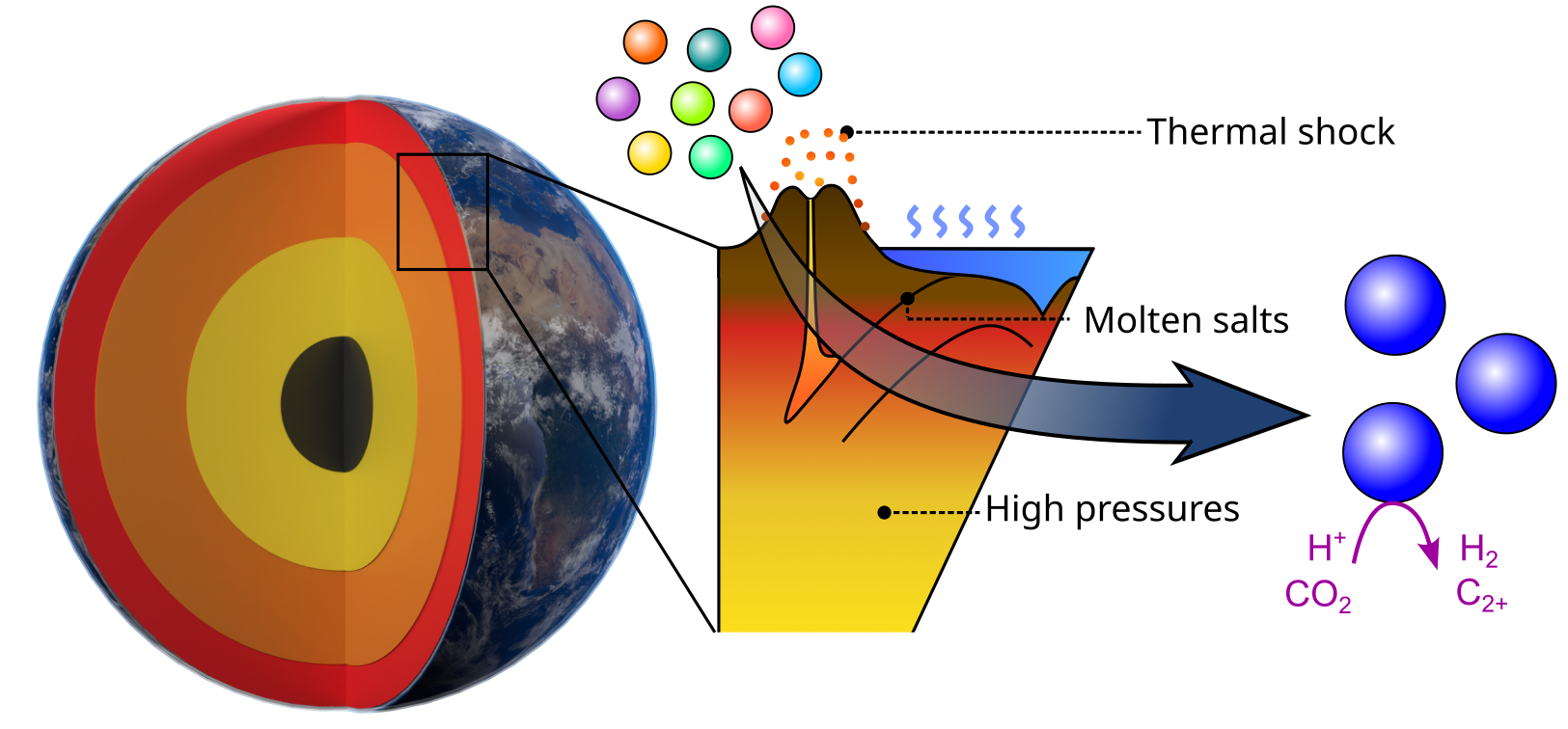 We apply this concept of geo-inspired syntheses to the design of rare materials combining covalent and metallic bonds, hence localized and delocalized chemical bonds at the same time. This combination can bring unique atomic charge states and environments, which can deeply impact electrocatalytic properties applied to the production of dihydrogen from water and to the valorization of carbon dioxide. Such chemical bonds are met in compounds of transition metals with elements like boron, silicon and phosphorus. Only few known solids combine such elements into ternary or quaternary solids, which hints at an unexplored landscape of new materials.