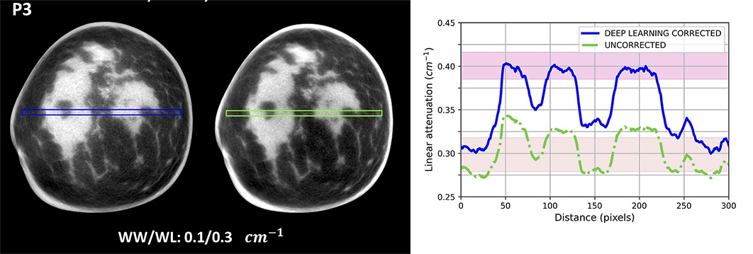Finally, a reconstruction method to quantify and reconstruct the iodine concentration throughout the imaged breast was implemented and initially tested. This method seems to recover the iodine content accurately in basic simulations, and is now being extended to be able to reconstruct 4D breast CT iodine images.